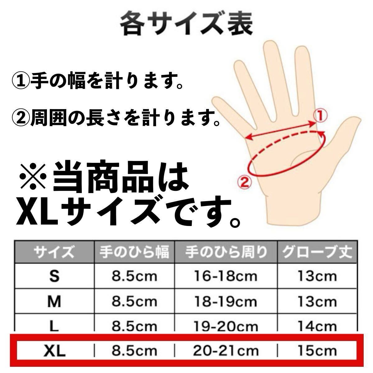サイズ(手の周囲)は XL(20~22cm)サイズは個人差があるため、目安としてご利用いただけます。ピッタリフィットが好みの方は小さめのサイズを選択してみてください。安全で快適なライディングのために、ぜひこのグローブをご検討ください!