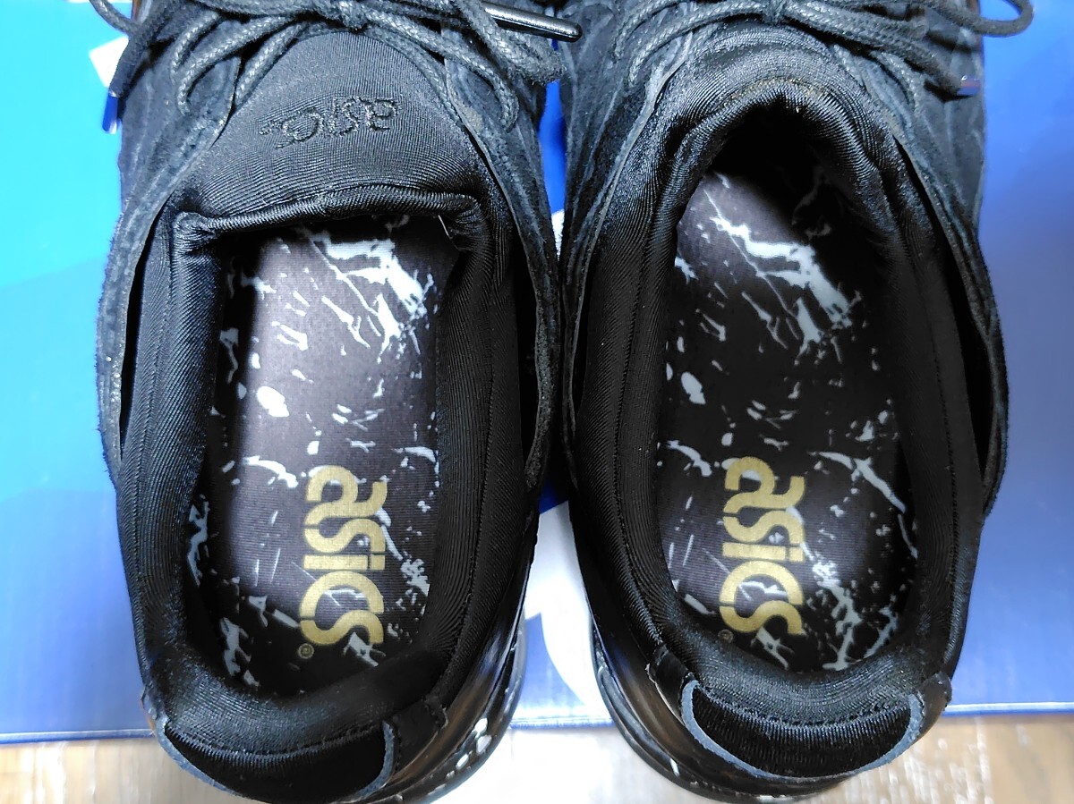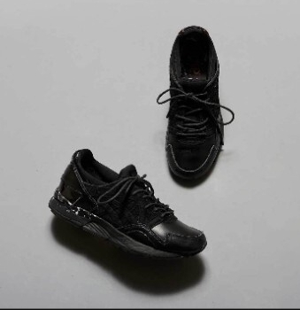 アッパーはトゥやかかと部分にガラスレザー風の光沢のある革を採用し、履き口周辺にはキメが細かく質の良いスウェードを配置、またミッドソールやインソールには、アクセントになる大理石のマーブル柄をプリント。