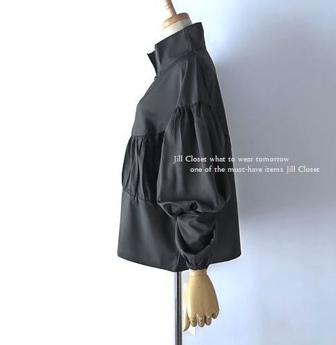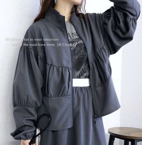 お洒落なスタンド衿&ギャザー・バルーンスリーブジャケット。モード感溢れるクールなデザイン。軽量で柔らかな質感。季節の変わり目・空調対策にも最適です。