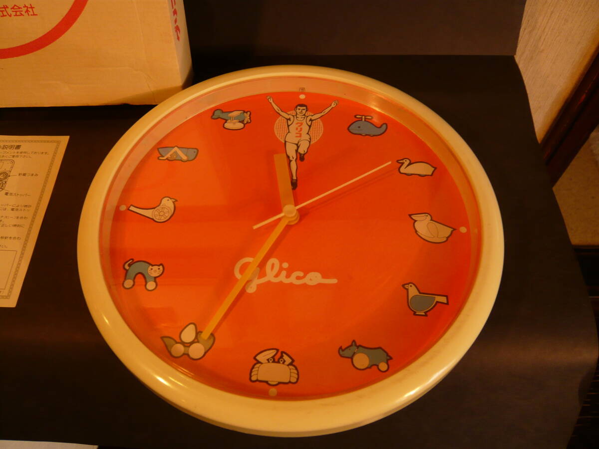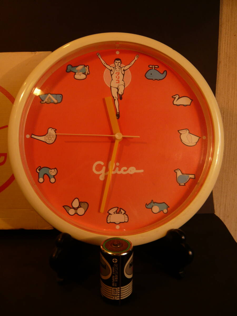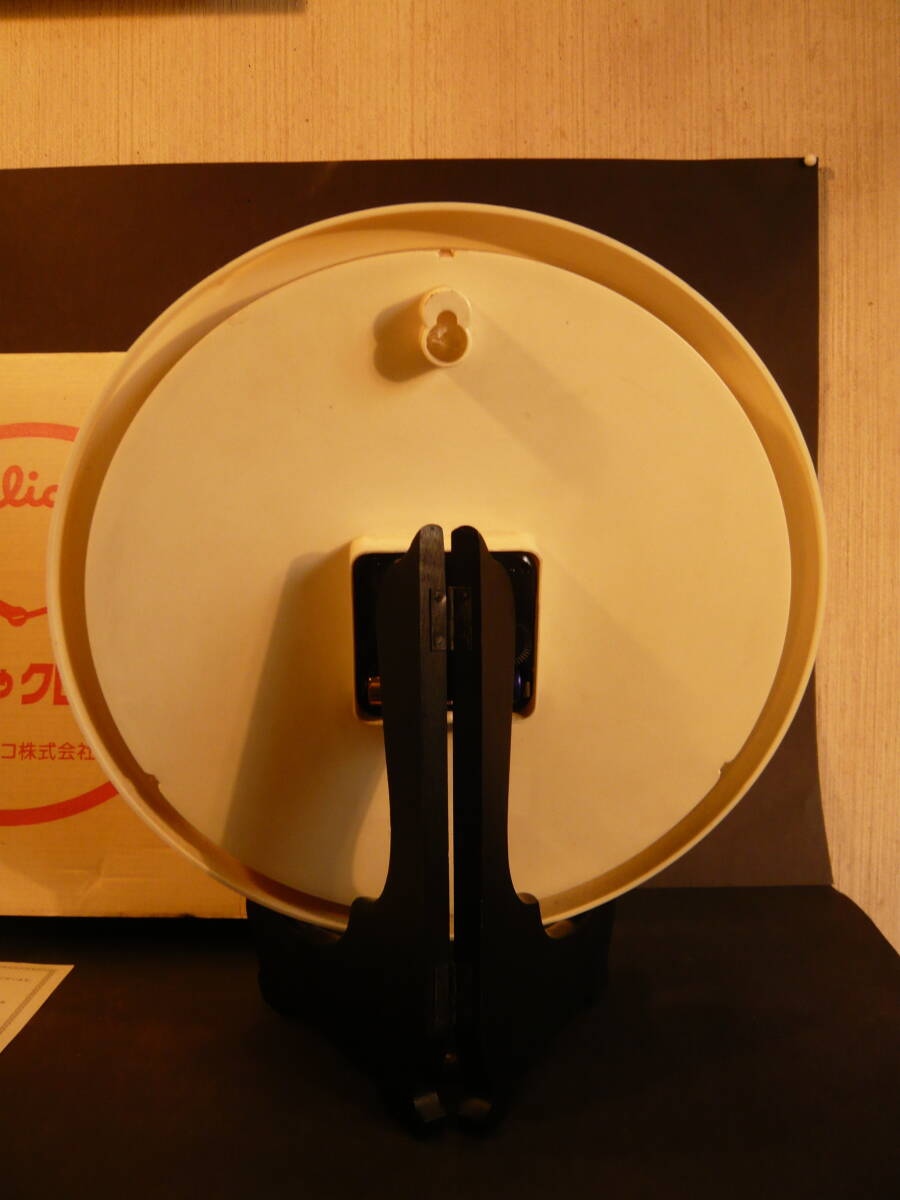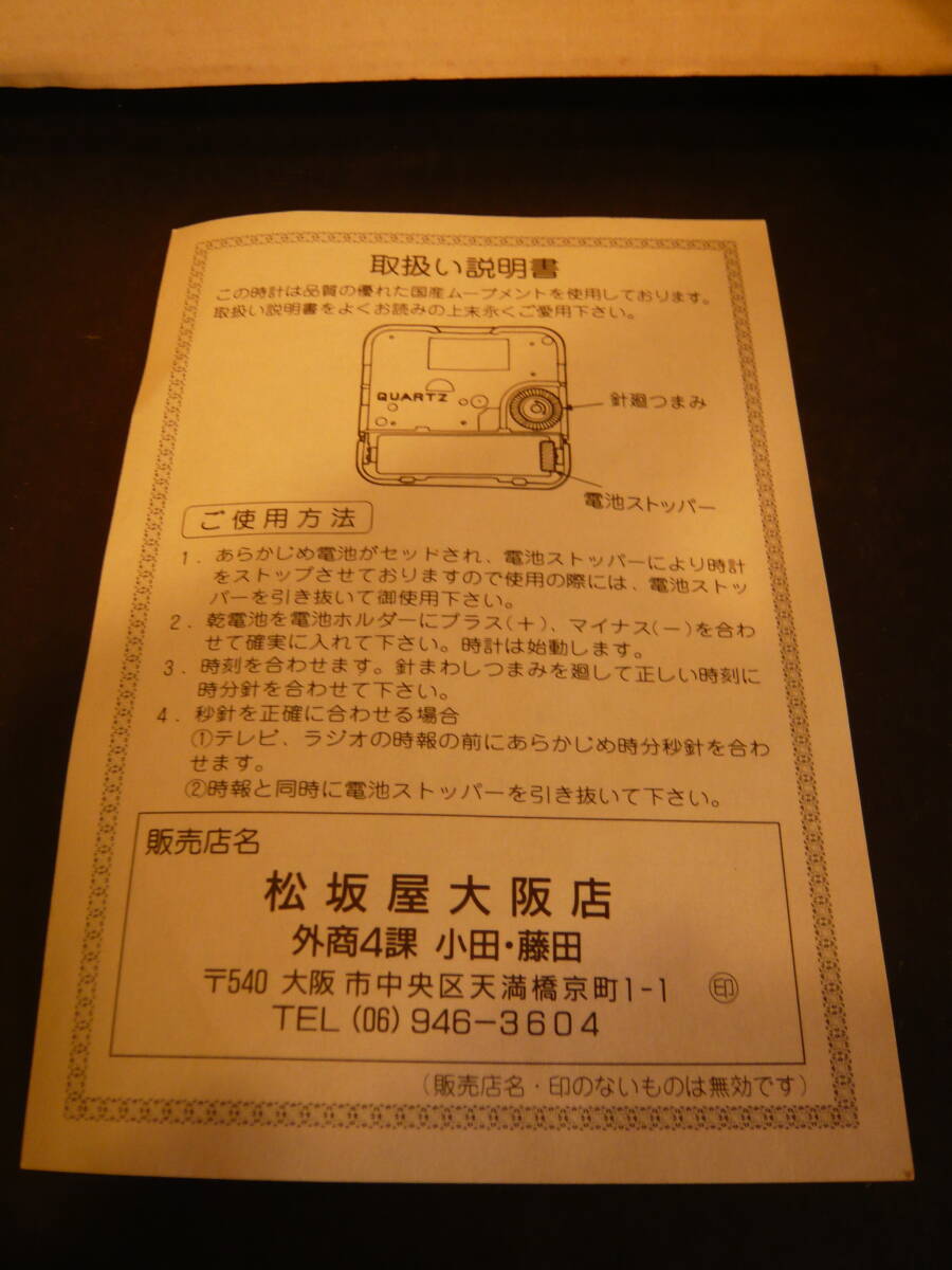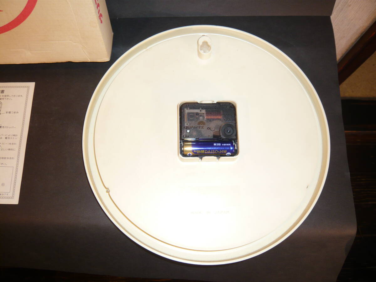 単三電池1本、稼働品です。箱のサイズは、縦横約26センチ、厚み約4.3センチ、時計のサイズは、直径約25.4センチ、厚み(クオーツ時計部分も含め)約3.3センチです。