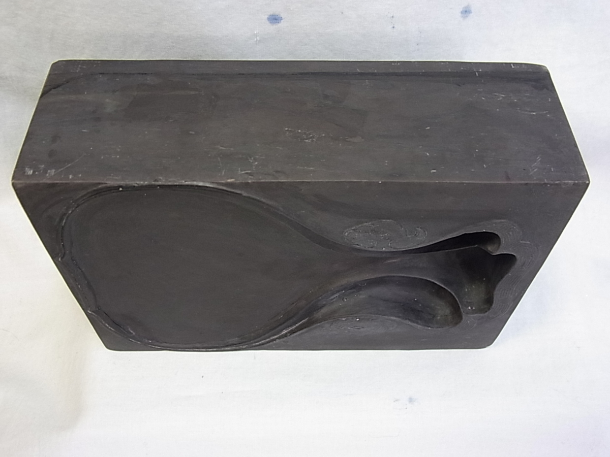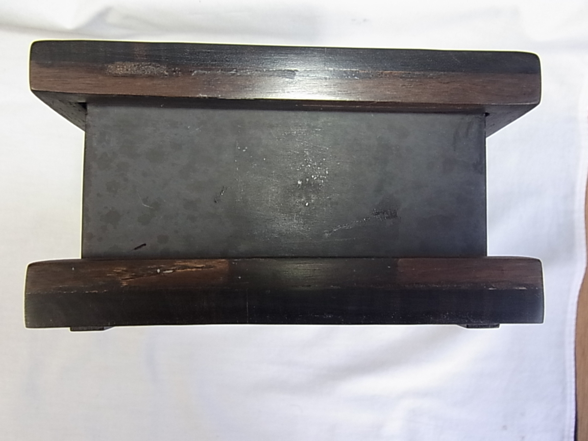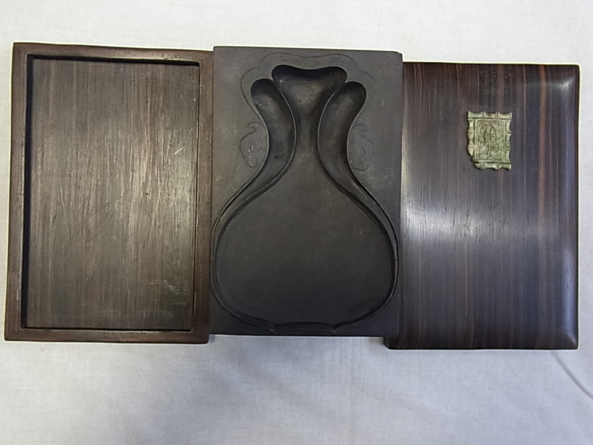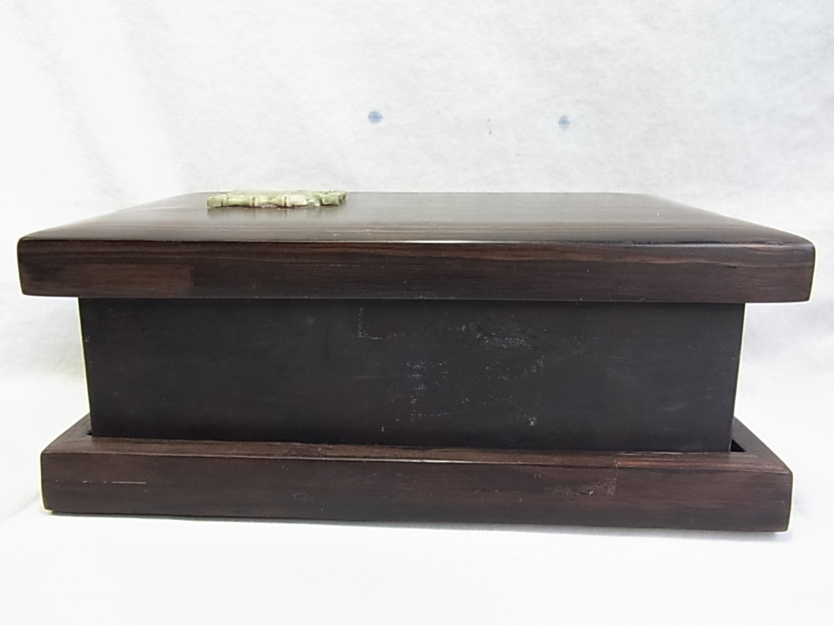 ●●●【硯:堅木台&上蓋翡翠飾り一部欠け有り付き:寸法200mm×80mm:重量700㌘:硯寸法174mm×117mm×縦57mm:総重量3キロ:底の部分原石の角10mm前後の欠け有り:上部角小さな欠け有り。32500