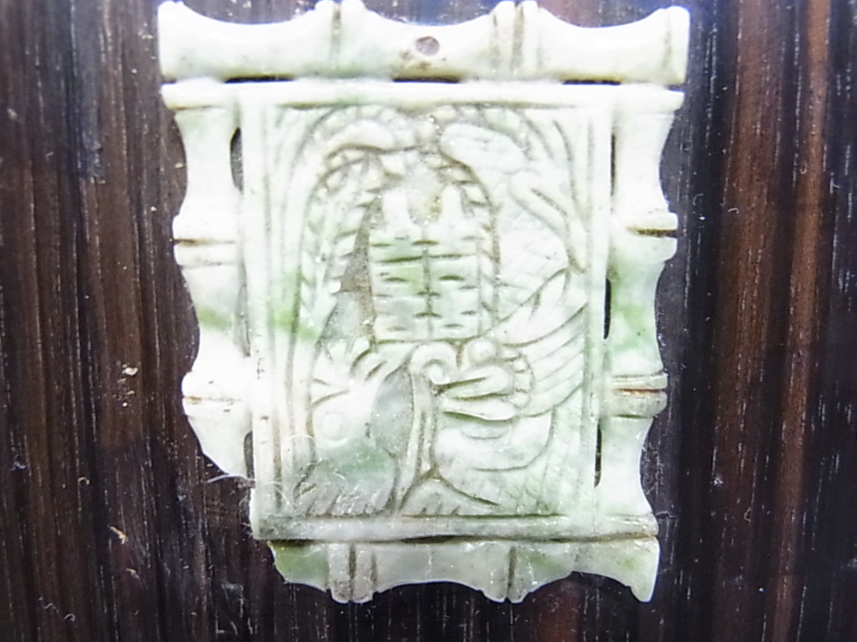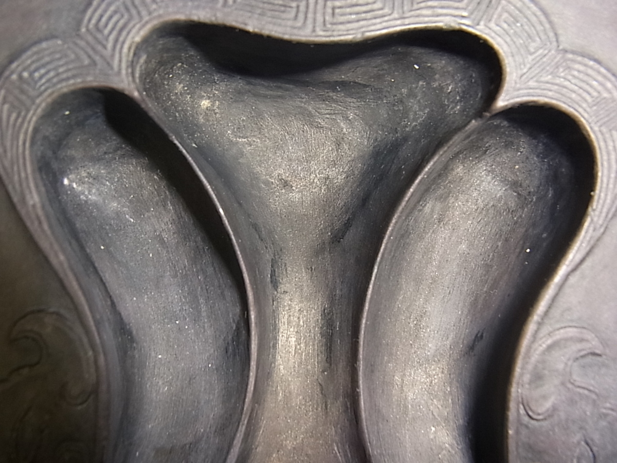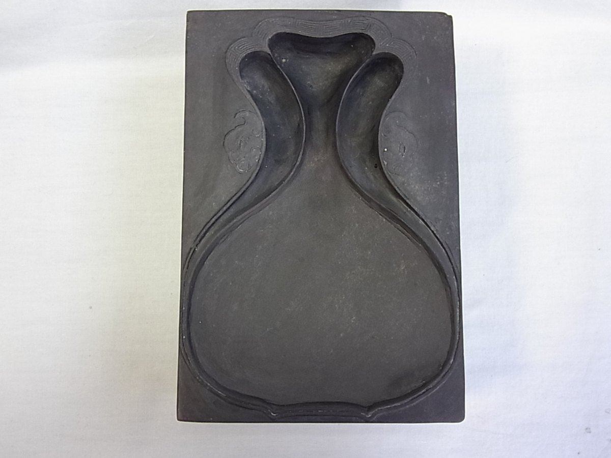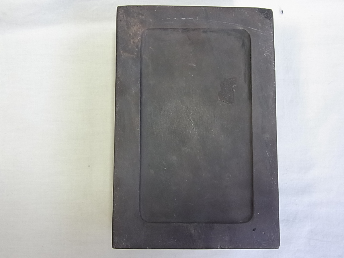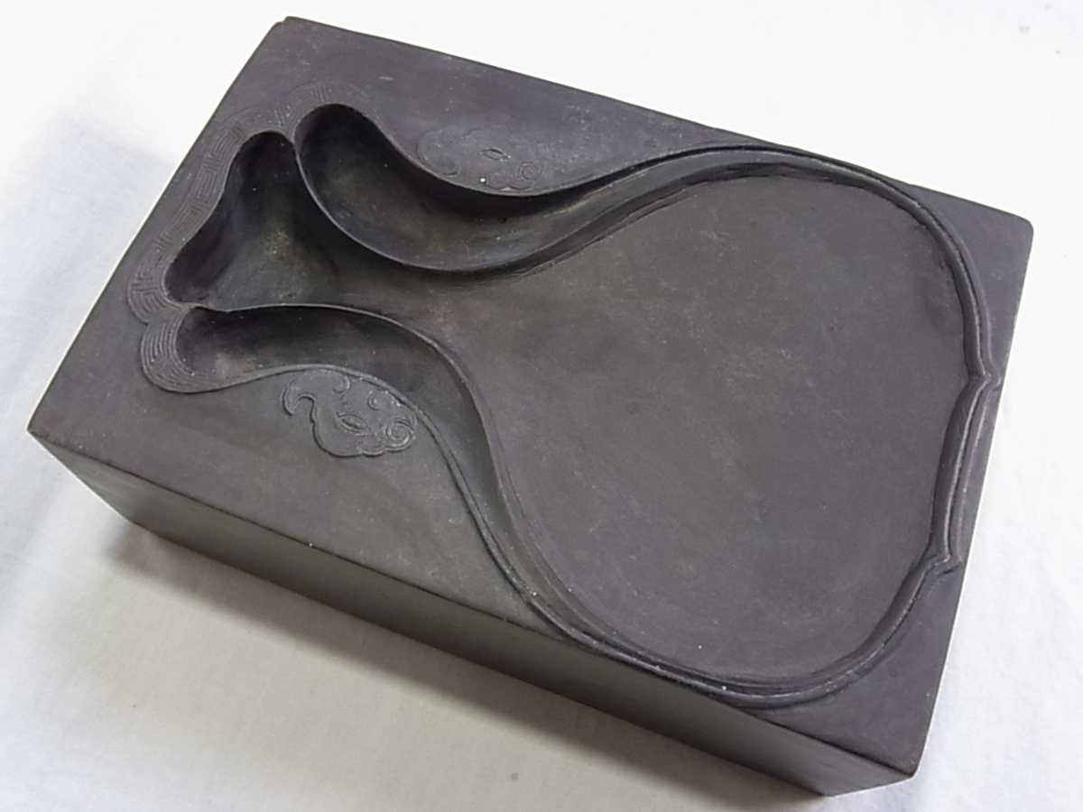 ●●●【硯:堅木台&上蓋翡翠飾り一部欠け有り付き:寸法200mm×80mm:重量700㌘:硯寸法174mm×117mm×縦57mm:総重量3キロ:底の部分原石の角10mm前後の欠け有り:上部角小さな欠け有り。32500