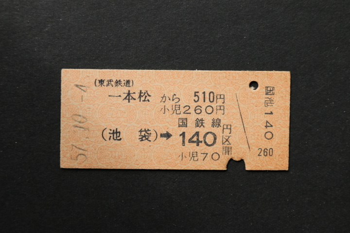 東武鉄道 乗車券 一本松から 510円 池袋→140円区間