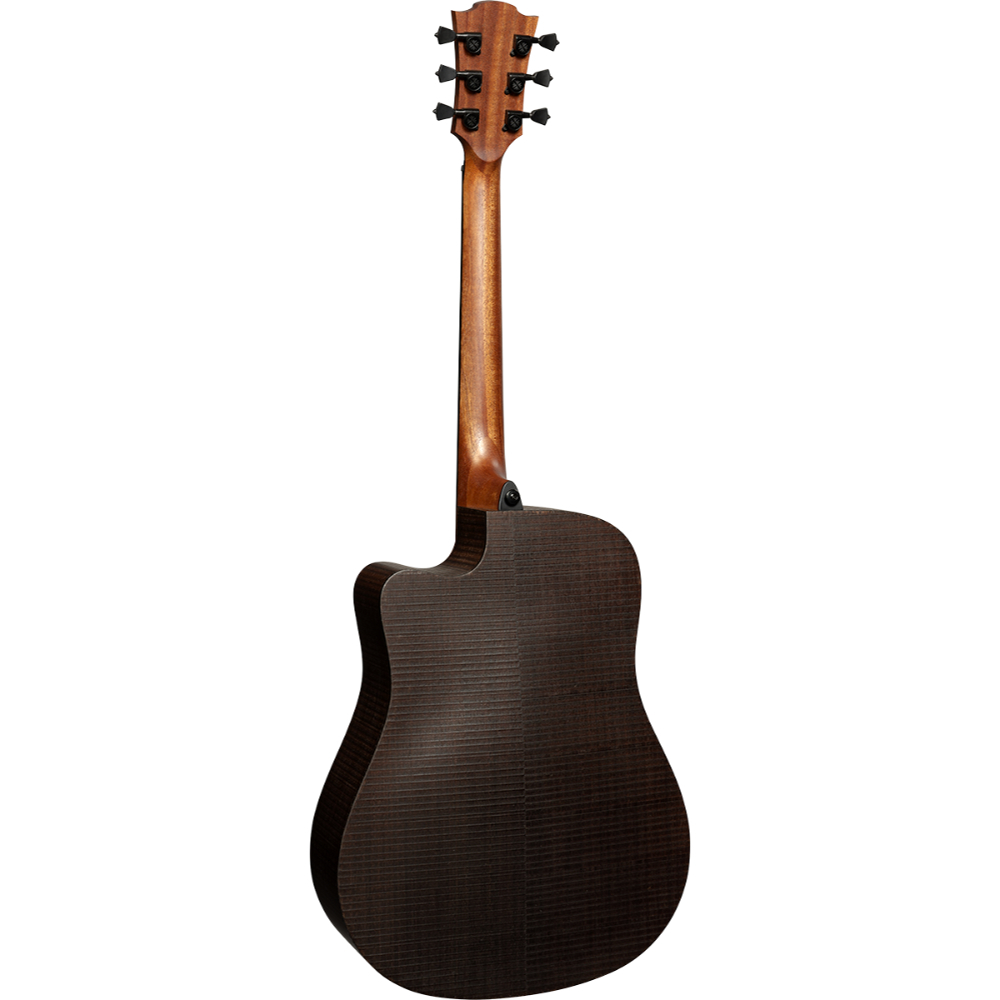 単板のトップ材(ペール・ブランコウッド)、および指板とブリッジ(ブラック・ブランコウッド)に使用されている FSC 認定のブランコウッドは、革新的な熱処理によって生まれた再生可能な木材です。その音色は、希少木材や保護木材、または自然保護木材のトーンを感じさせます。 また、スモーク・ユーカリを活用したボディ・バック&サイドの仕上げも、仕上げのサンディング時に発生する微粒子や化学物質の排出を抑えるよう配慮されています。背面の形状にもこだわり、大きなボディ・カーブによる豊かな低音を実現しました。