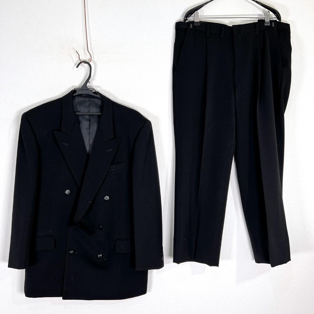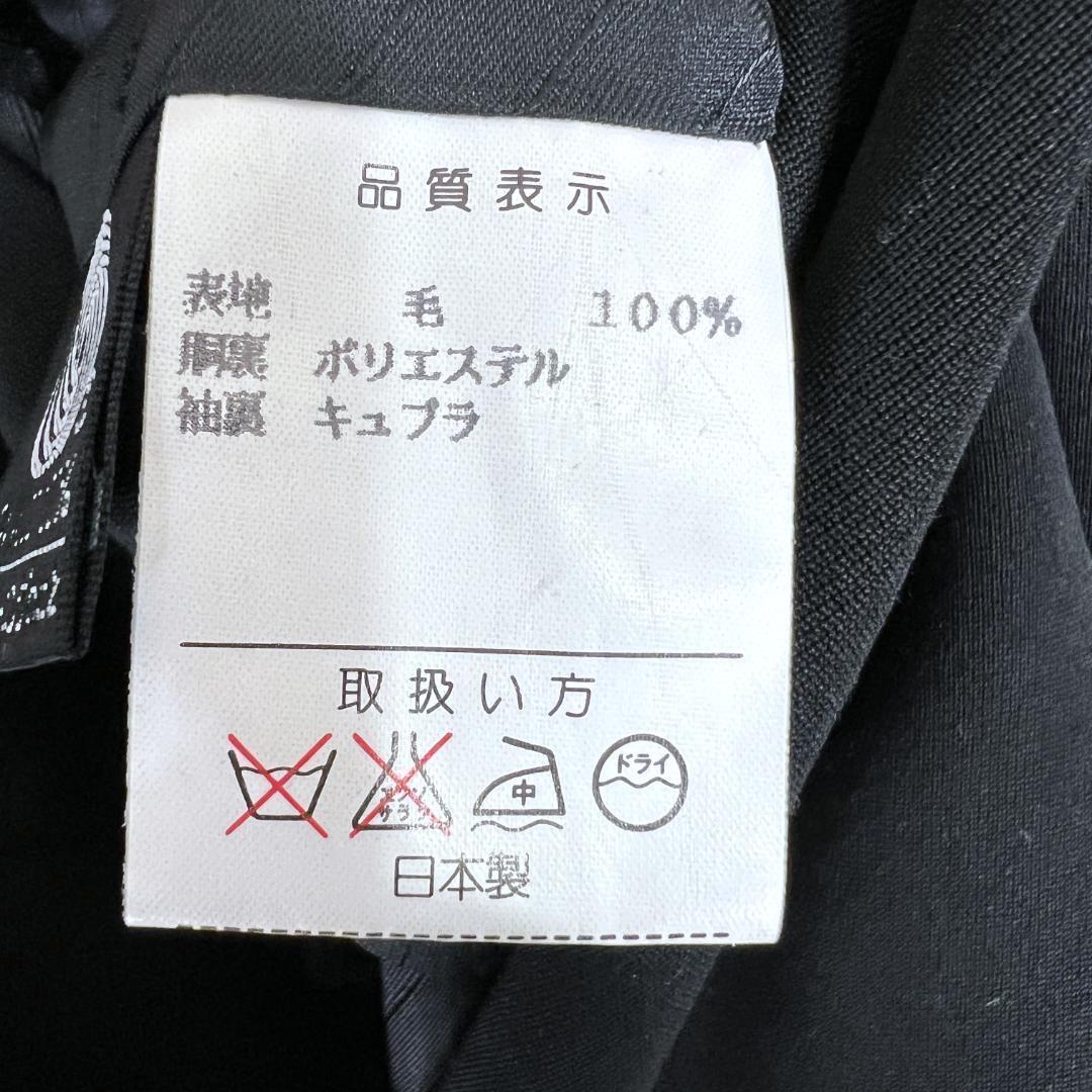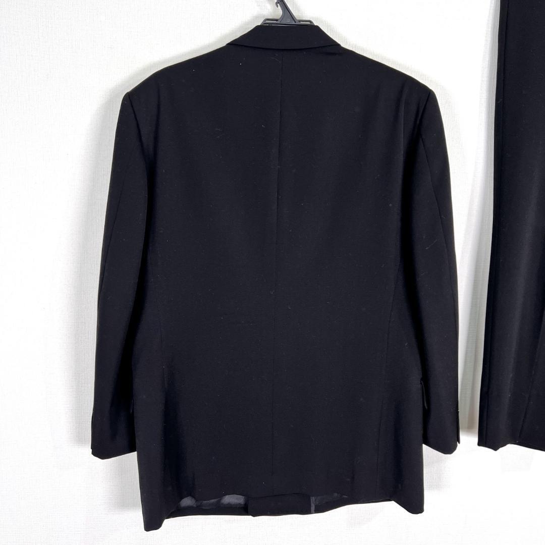 男性用 紳士用の黒 ブラック系のシングルジャケット×パンツ スーツ セットアップ 上下セットです。中古品ですが目立つような傷や汚れもなくまだまだ使っていただけます。内側に刺繍ネームがありますのでご了承ください。古着 CHODAI CO., LTD.