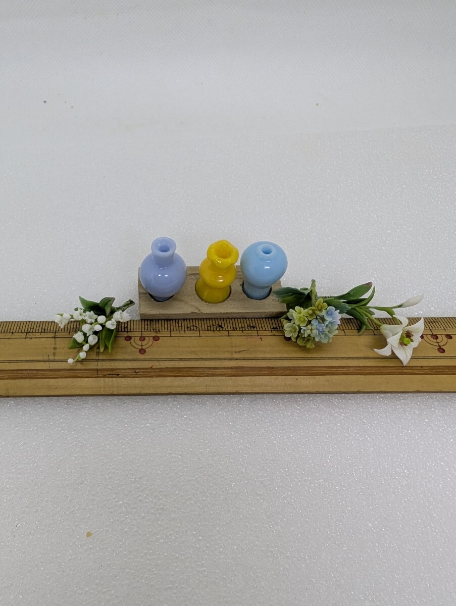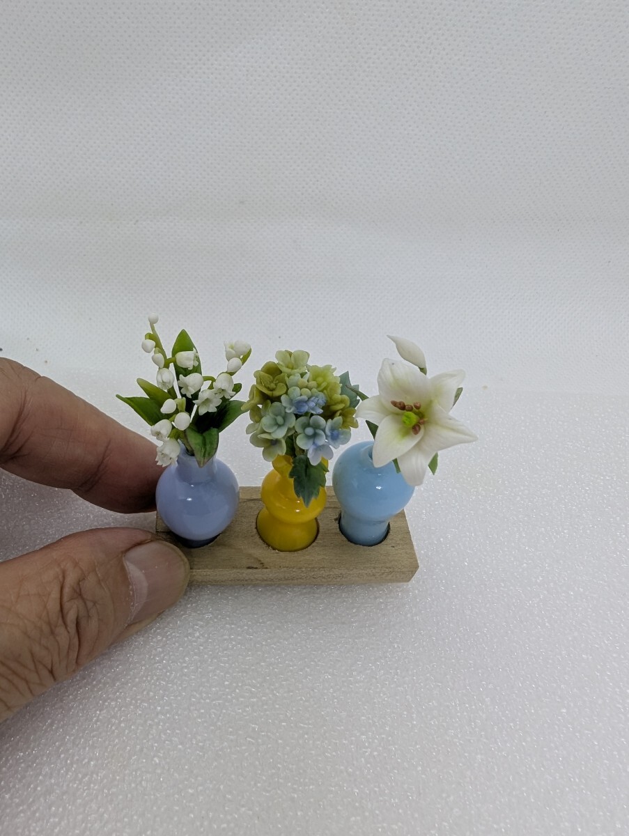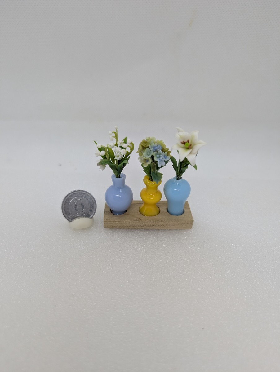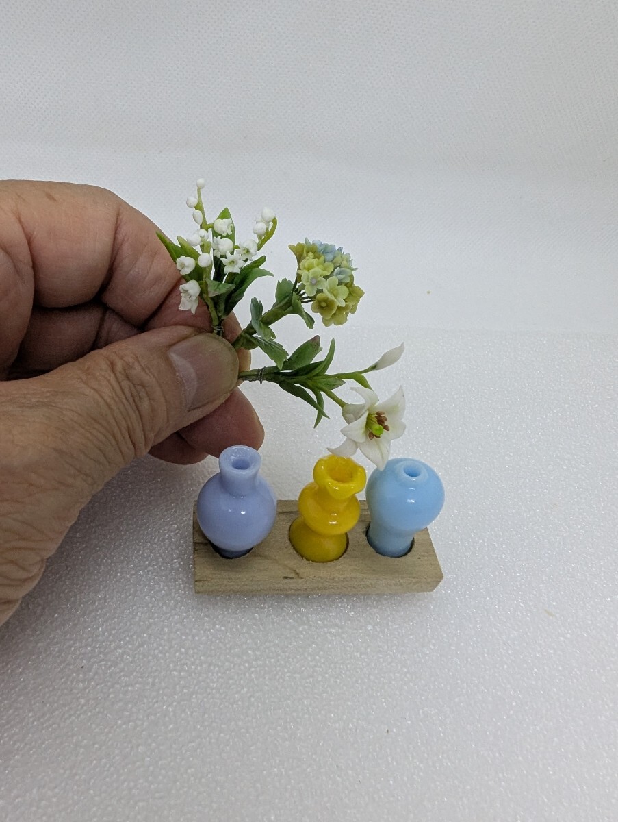 樹脂粘土で小さなカサブランカ、スズラン、アナベルを作り、市販の花瓶に活けました。花瓶は台に接着してます。