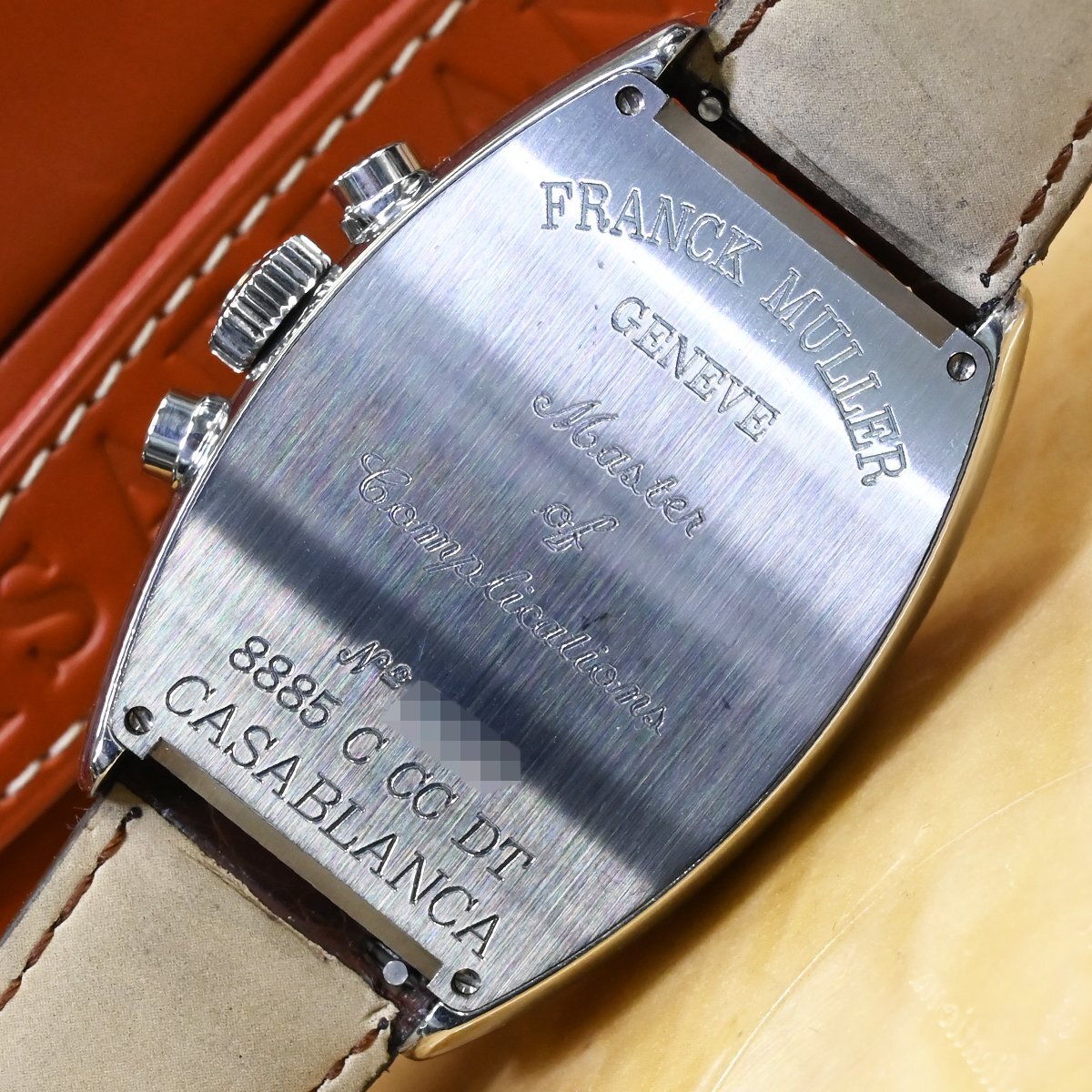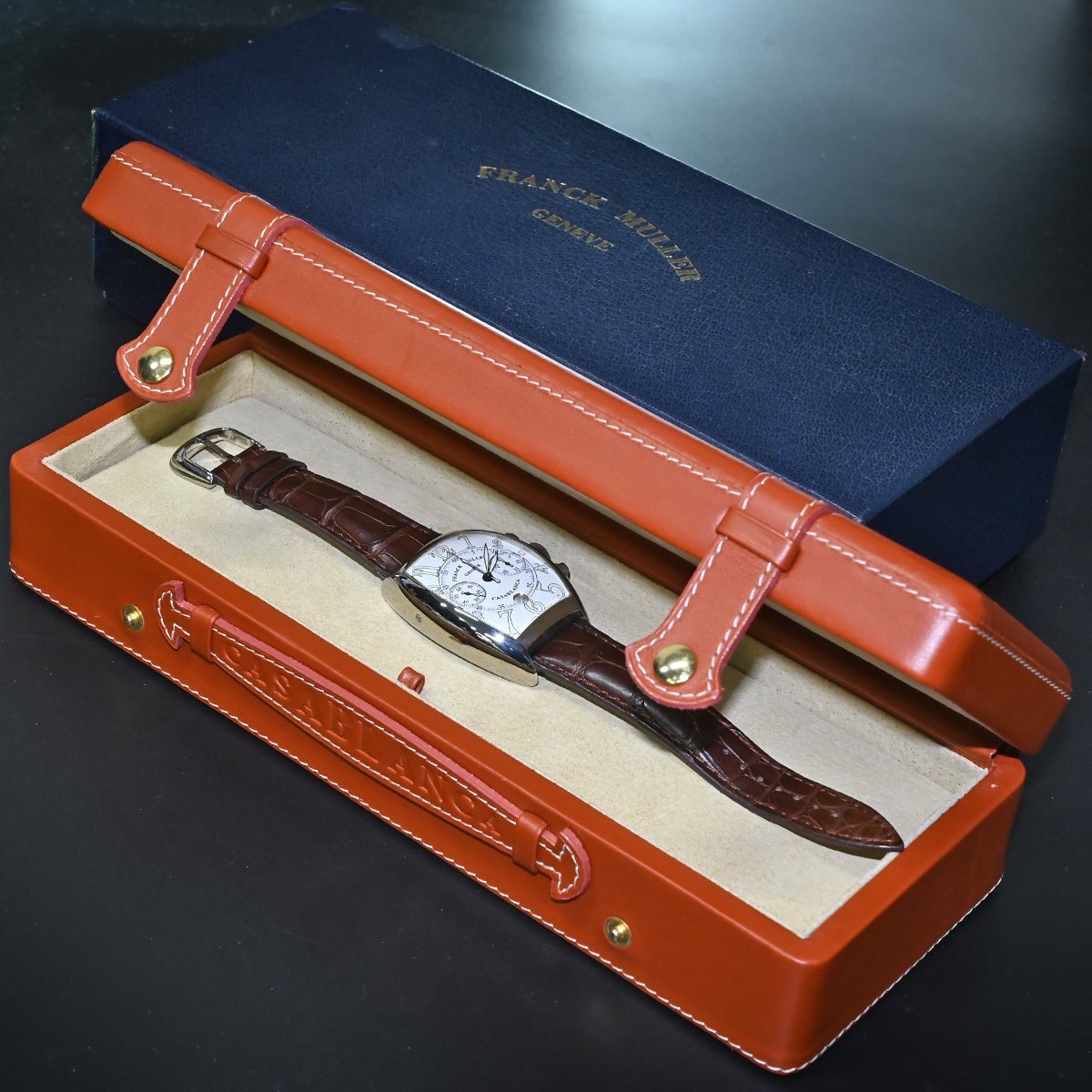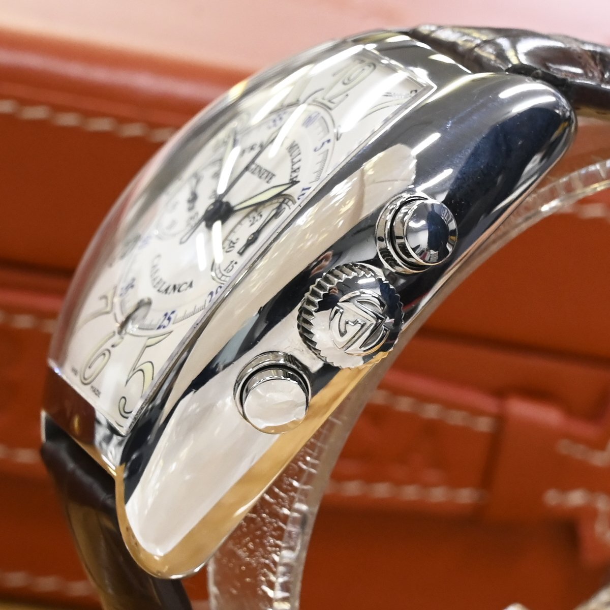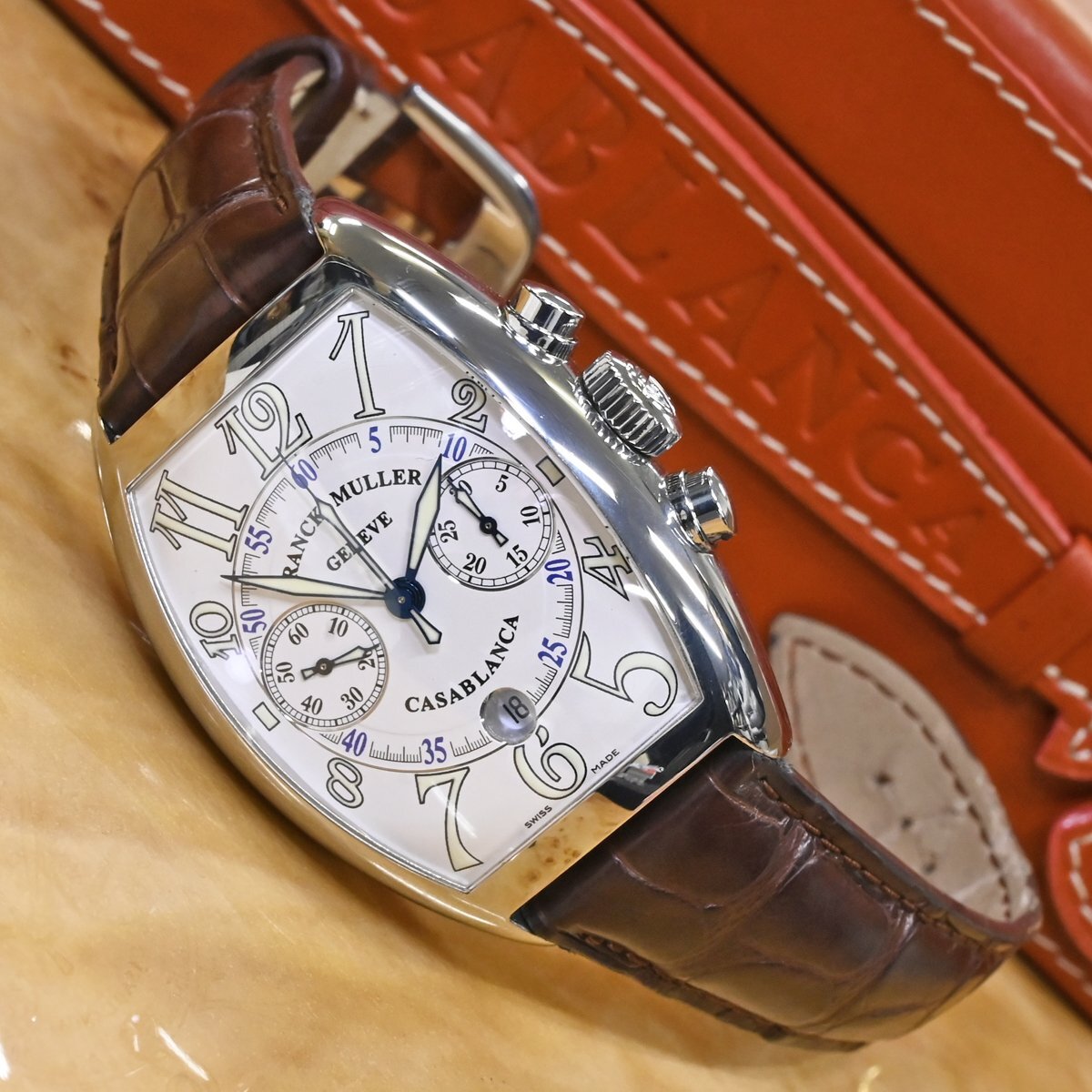 フランク・ミュラーの8885CCCDT サブランカ クロノグラフです。 1994年の登場以来フランク ミュラーの代名詞であり続ける「カサブランカ」。 圧倒的な存在感を放つ88ケースのクロノグラフです。 フランク ミュラーのオートマティッククロノグラフは、5850サイズなどで90年代後半あたりから発売されようになりますが、数々の名作コンプリケーション群の影に隠れてしまい当時から見かけることが少ない時計となっていました。 市場流通量の圧倒的に少ないモデルなのでお探しの方も非常に多いかと思います。 ※基本動作確認済。 |