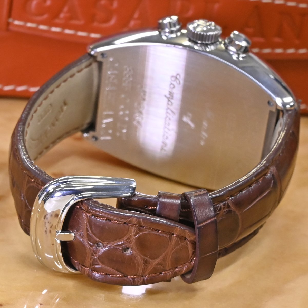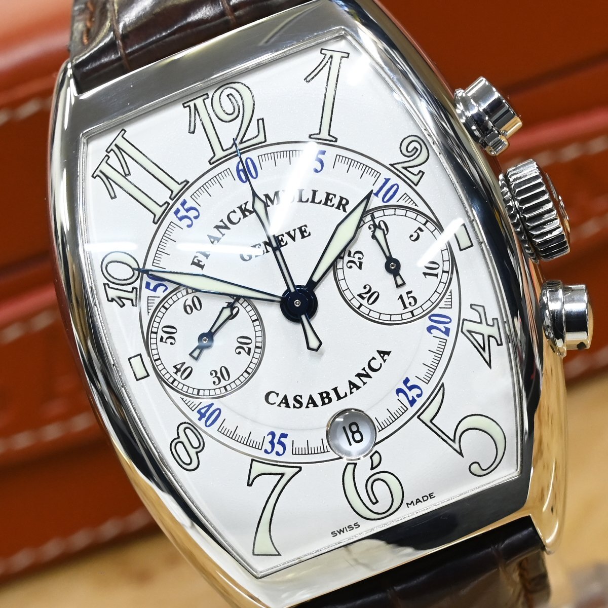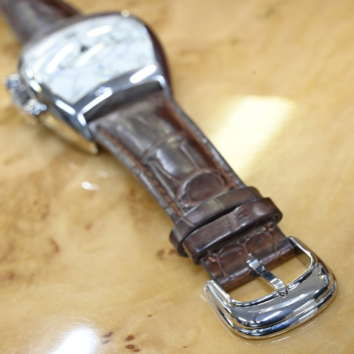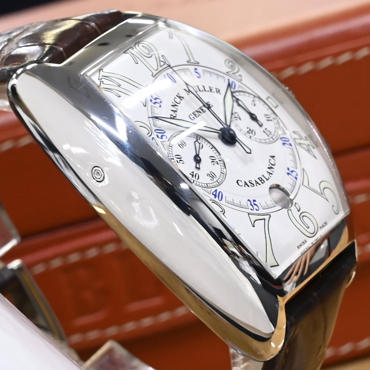 フランク・ミュラーの8885CCCDT サブランカ クロノグラフです。 1994年の登場以来フランク ミュラーの代名詞であり続ける「カサブランカ」。 圧倒的な存在感を放つ88ケースのクロノグラフです。 フランク ミュラーのオートマティッククロノグラフは、5850サイズなどで90年代後半あたりから発売されようになりますが、数々の名作コンプリケーション群の影に隠れてしまい当時から見かけることが少ない時計となっていました。 市場流通量の圧倒的に少ないモデルなのでお探しの方も非常に多いかと思います。 ※基本動作確認済。 |