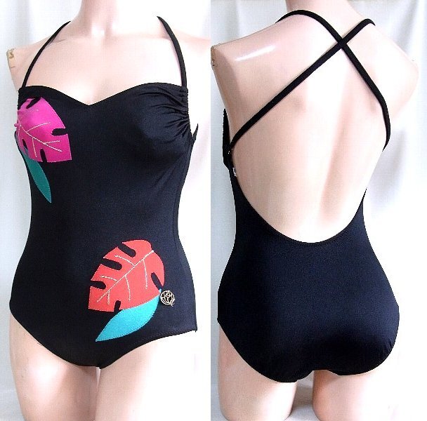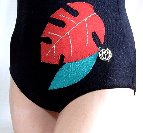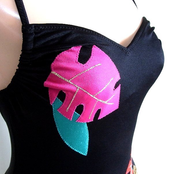 ★☆赤ピンクリーフパッチワーク付き黒ワンピース水着☆★