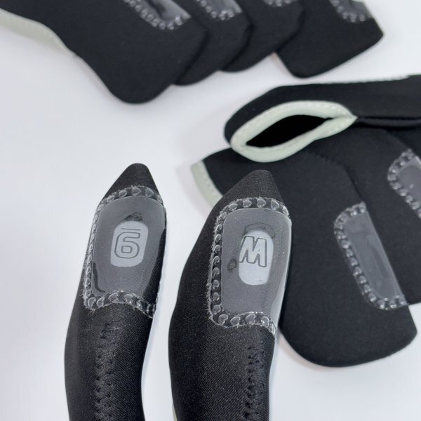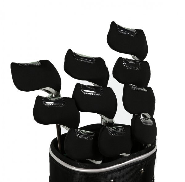 ネオプレン製のアイアン用ヘッドカバー10個セット、ブラック。窓付きで番手表示が見えます。柔らかい素材で着脱が簡単です。クッション性がありアイアンヘッドの保護になります。