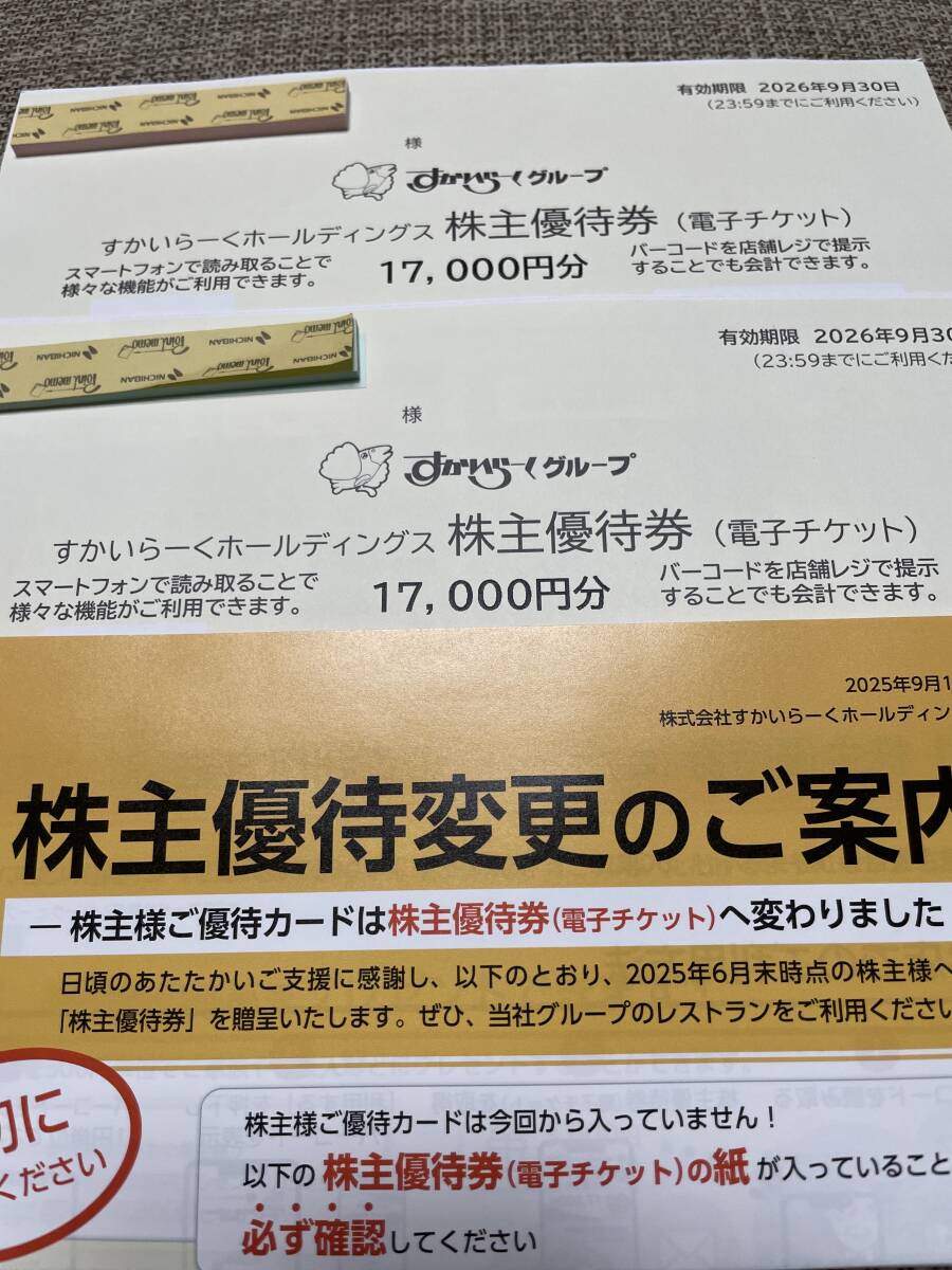 すかいらーくグループ 株主優待券 34,000円分(17,000円2枚)です。