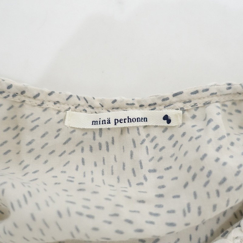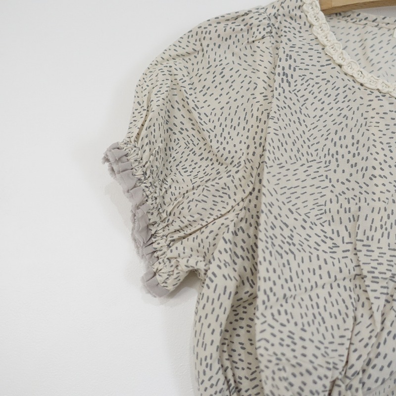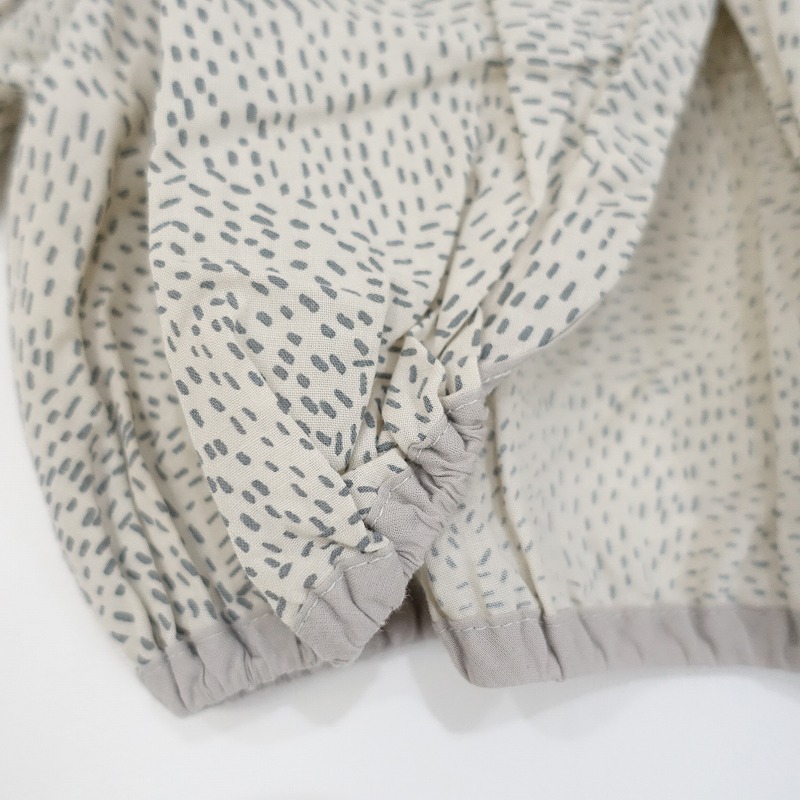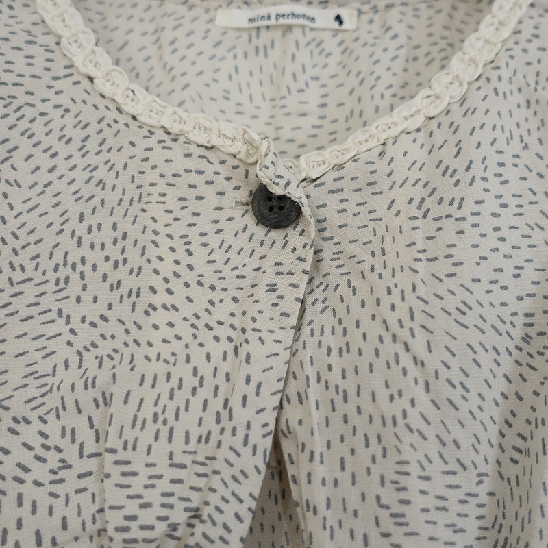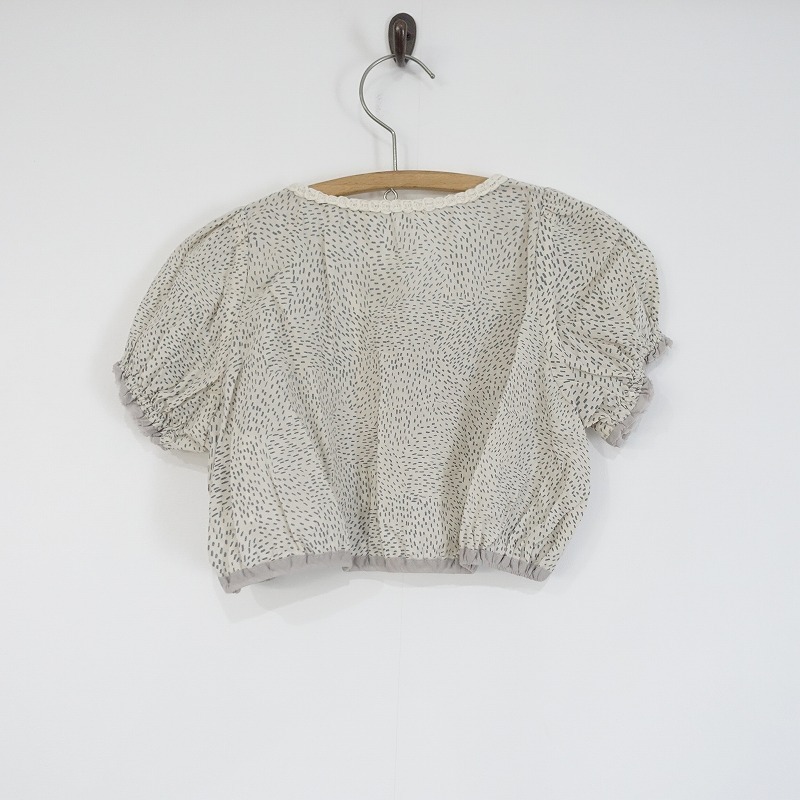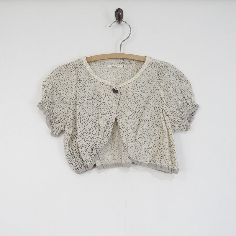 | mina perhonenのforest parade コットンキャメルボレロです。カラーは淡いライトアイボリー×グレーで、微透け感のある薄手素材です。フロントセンタートップボタン1ヶ所留めで、ネック周りに飾りレースがあしらわれております。袖口&裾の縁ははライトグレー生地でゴムが通っており、袖口縁はレイヤードの裁ち切り仕様になっております。 |