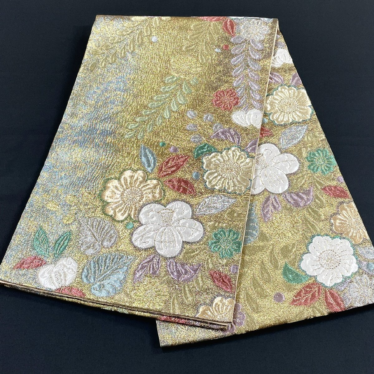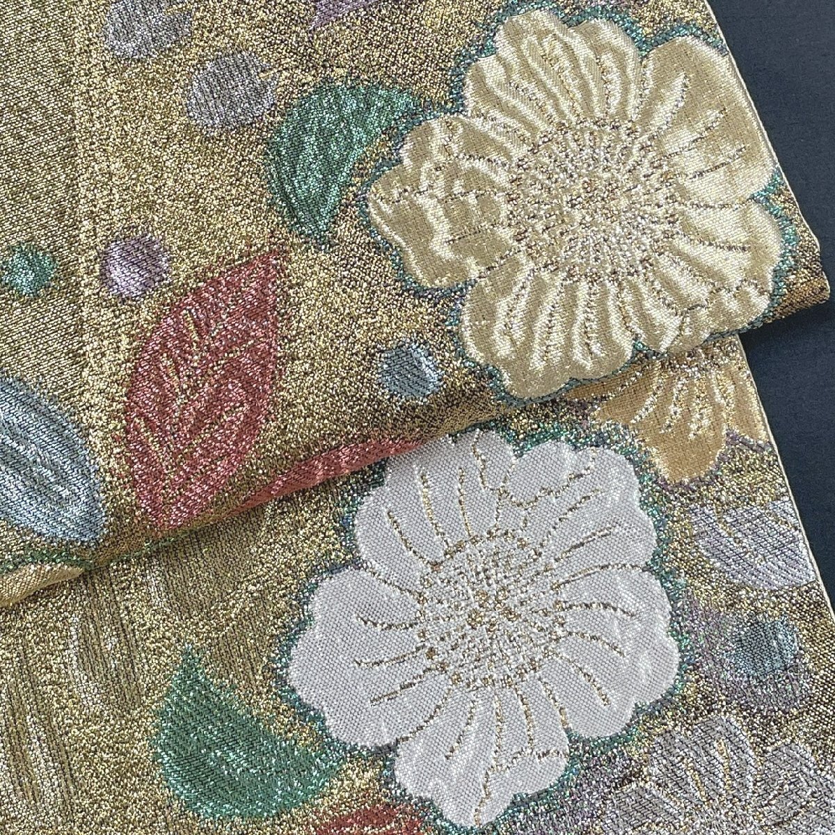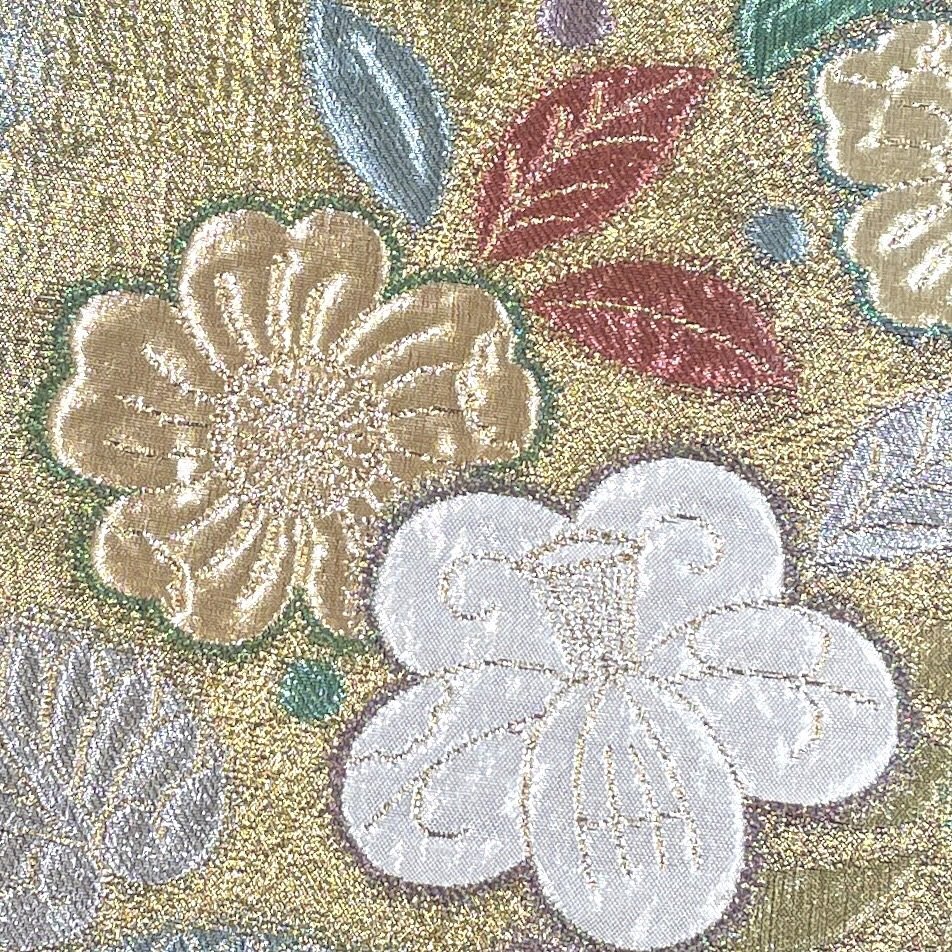 着物月花 引箔 艶やかな花 袋帯 六通柄 正絹 金銀糸 ob7217