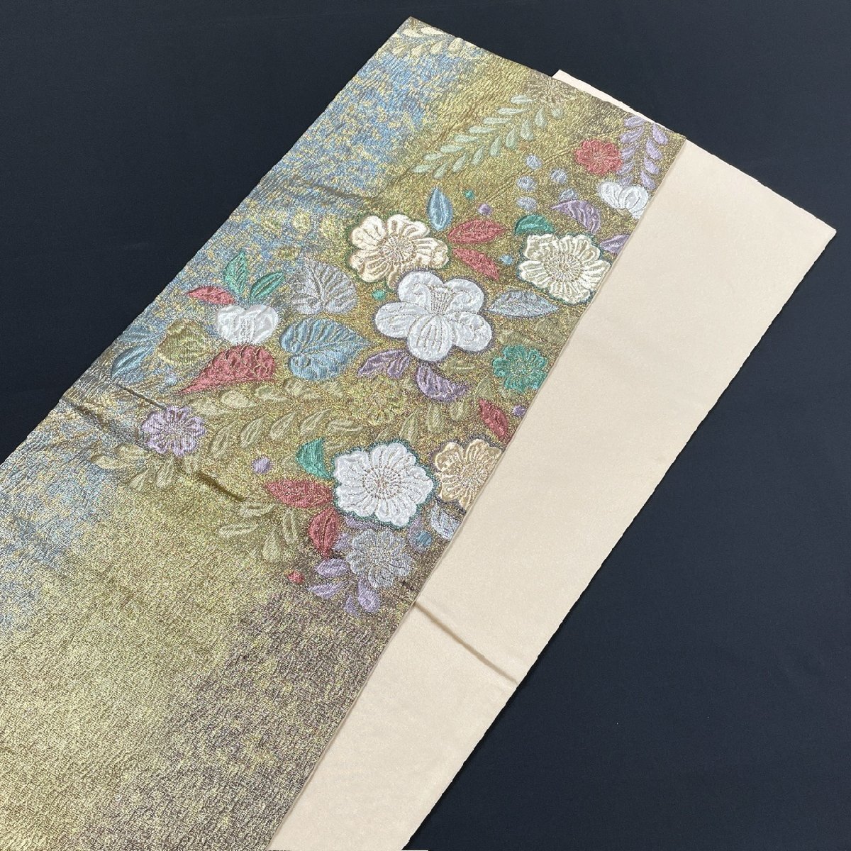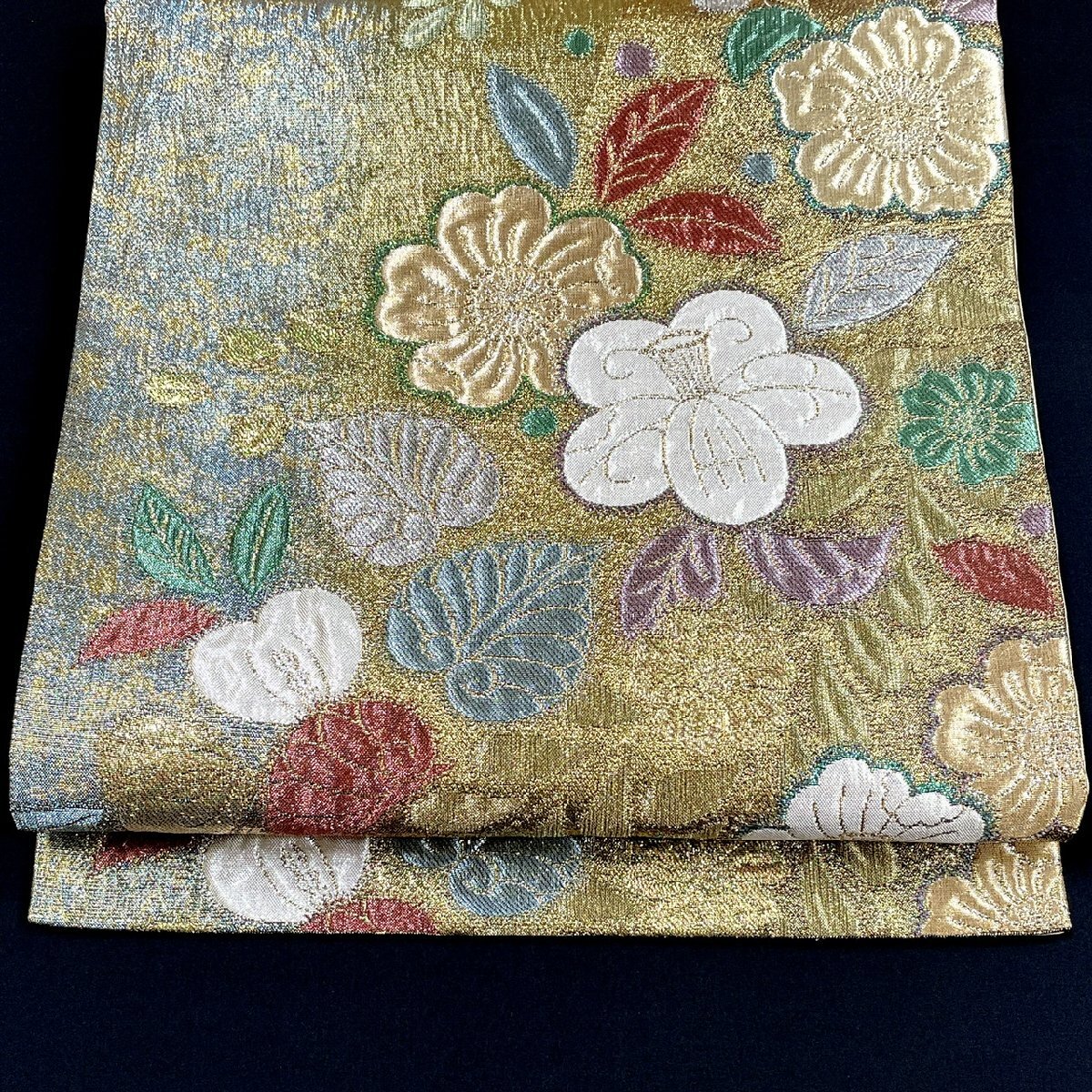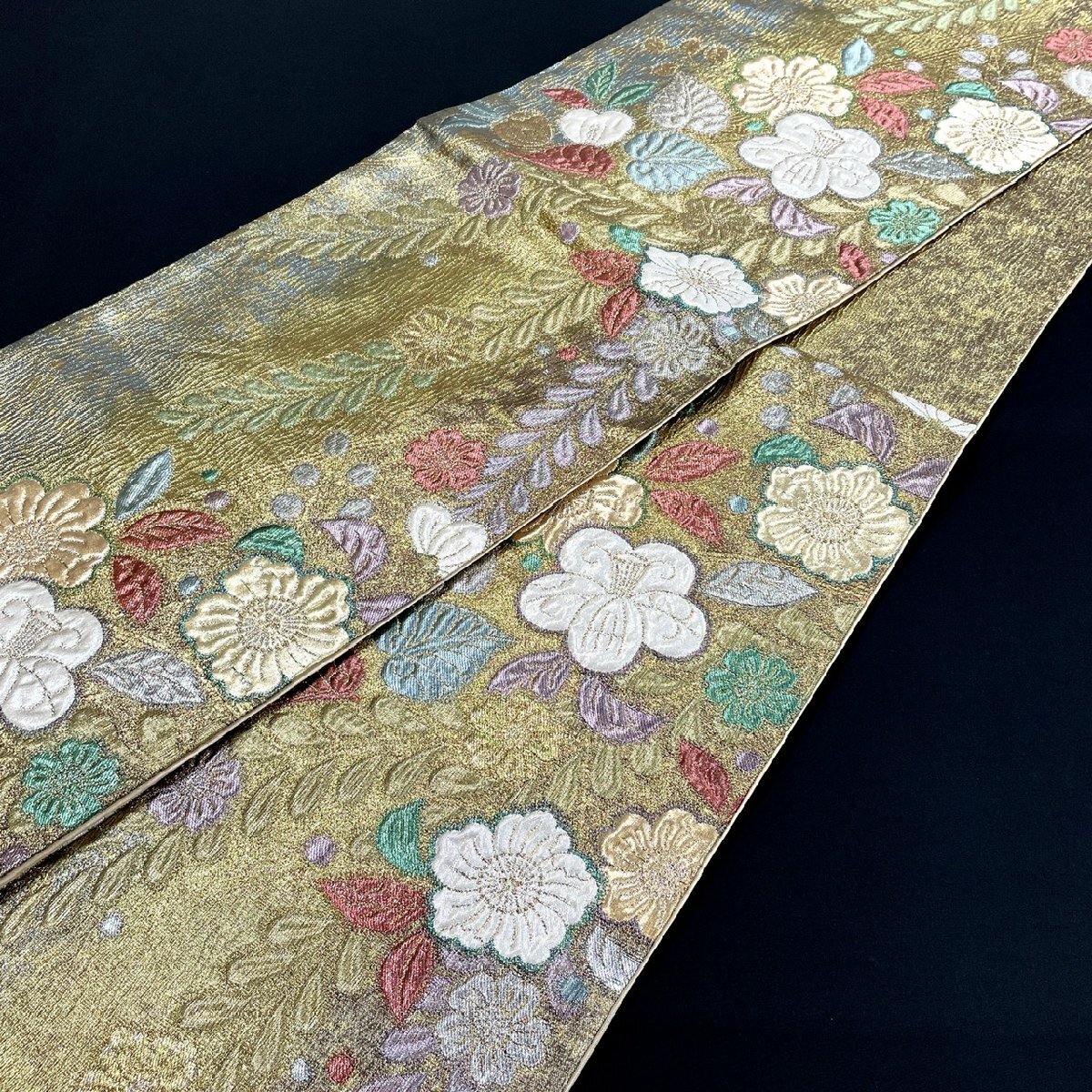 着物月花 引箔 艶やかな花 袋帯 六通柄 正絹 金銀糸 ob7217