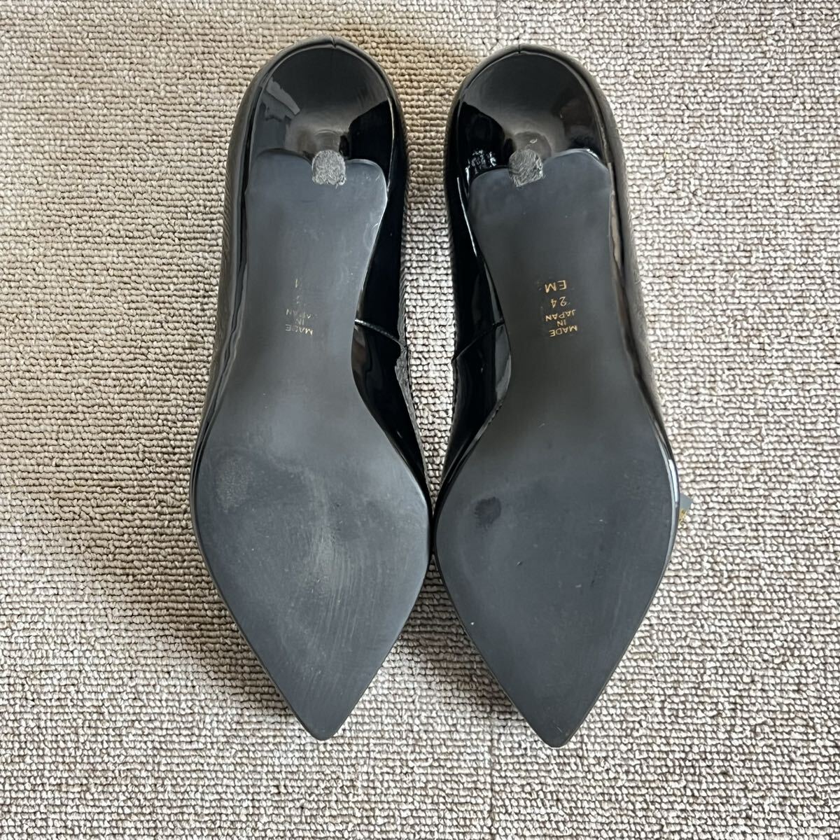 ブラックのエナメル素材に輝くビジューがアクセントになり、華やかさと高級感をプラス。