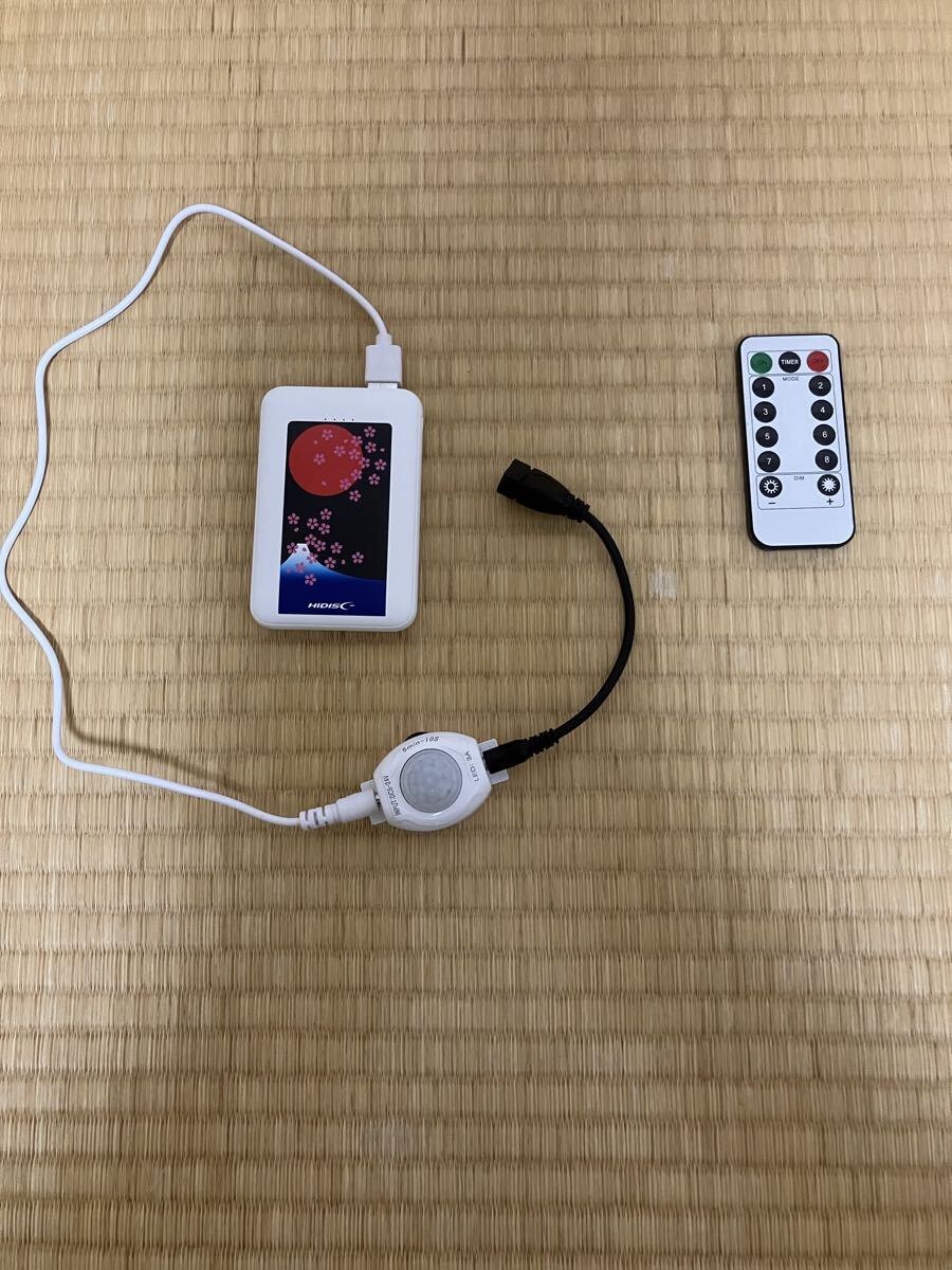 また、非常に賢く明るい所では反応しなく、ある程度暗くなるとセンサーが働く人感センサー付き。センサーのON時間はmin5秒からmax5分を任意に変えられます。また、コンセントが無い所でも対応できる様にモバイルバッテリーのパワーoff機能を解除しているバッテリーも付けます。