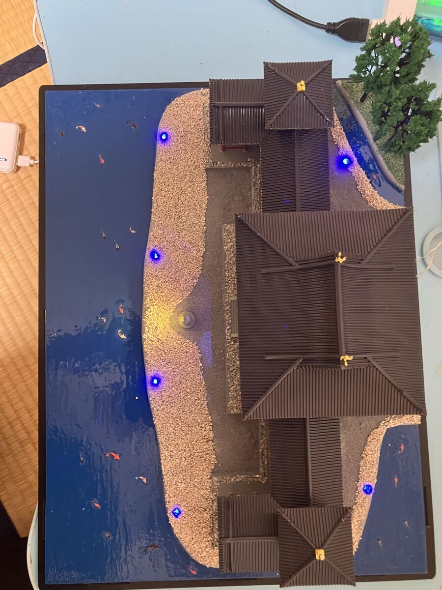 LEDは2タイプ搭載。灯籠と本堂は暖かい色、周りと本堂は青色の8パターン点灯点滅を変えられるリモコン仕様LED搭載。