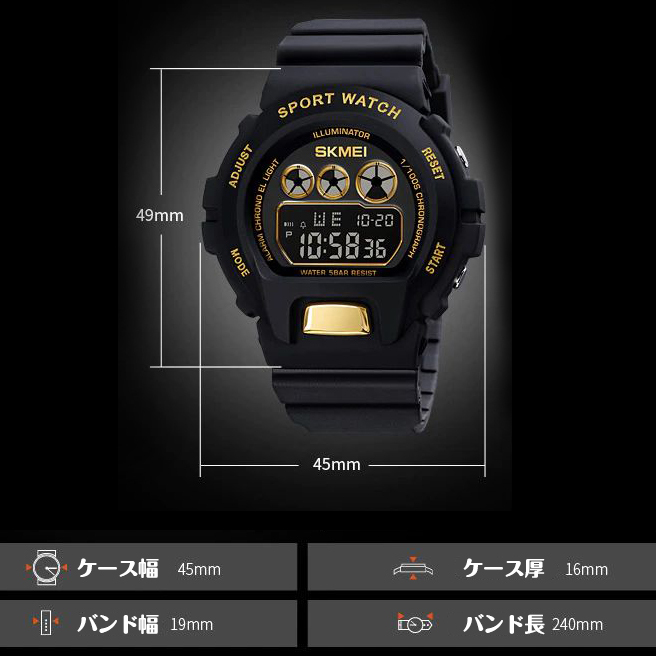 機能:時間表示(12時間/24時間表示)、日付表示、曜日表示、ストップウォッチ、アラーム、バックライト