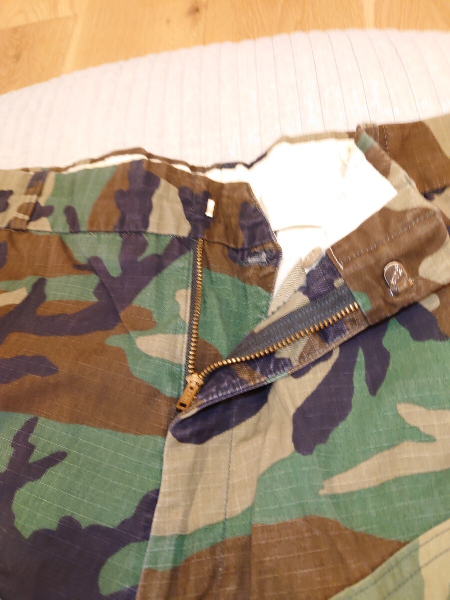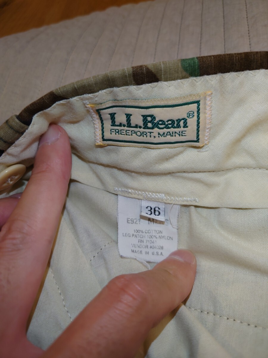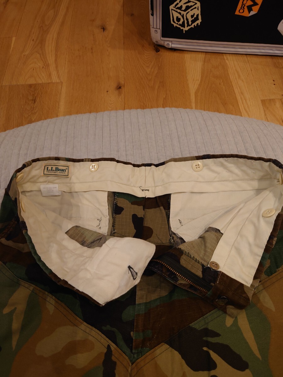 1980年代〜のLLビーンのハンティングパンツです。特筆すべきはウッドランドカモ柄が2種類使用されている所でしょう。下記の通りディテール盛り沢山です。状態もミントコンディションで、サイズも良いです。お探しだった方のご入札をお待ちしております。