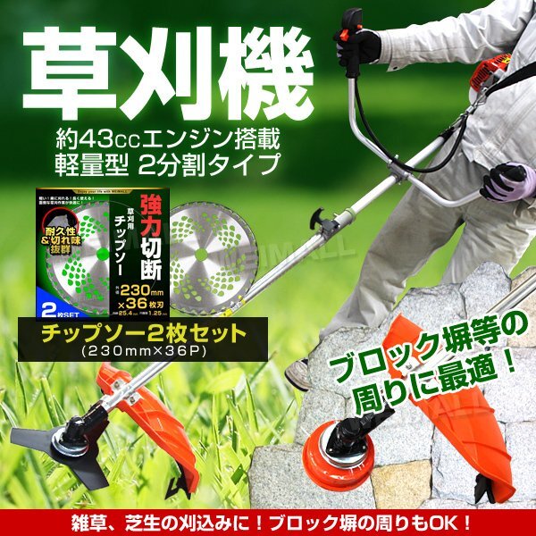 43ccのパワーエンジンは、伸びた草や固くなった枯れ草等をガンガン刈ります。 径の小さい木も刈れるので幅広く使える事も刈払い機の特徴です! 柔らかい草や金属刃では刈る事ができない所(フェンス等)で刈る「ナイロンカッター」が付属しています。 セットがお得な草刈機の替刃も別途販売中。 【商品仕様】 ★草刈り機仕様 ・エンジン:空気冷却/シングルシリンダー/2ストローク ・排気量:43cc ・燃料タンク容量:1.21L ・エンジン出力:1.45KW ・使用燃料:混合ガソリン(25:1) ・点火方式:電子点火 ・始動方式:リコイルスターター ・キャブレター:ダイヤフラム式 ・重量:7.04kg(本体のみ) ★チップソー仕様 ・サイズ 外径230mm ・刃数 36P ・枚数:2枚 【商品内容】 ・本体 ・チップソー2枚 ・カッターブレード ・ナイロンカッター ・飛散防護カバー ・ベルト ・燃料混合タンク ・サービス工具 ・取扱説明書(日本語) 【注意事項】 必ずゴーグル(保護メガネ)を着用の上、使用してください。 お得なセットもございます。 ↓↓↓↓↓↓↓↓↓↓↓ ★36Pチップソーセット 草刈り機 + チップソー(36P)10枚セット ★40Pチップソーセット 草刈り機 + チップソー(40P)10枚セット ※写真と実物は多少異なる場合がございます。あらかじめご了承下さい。 |