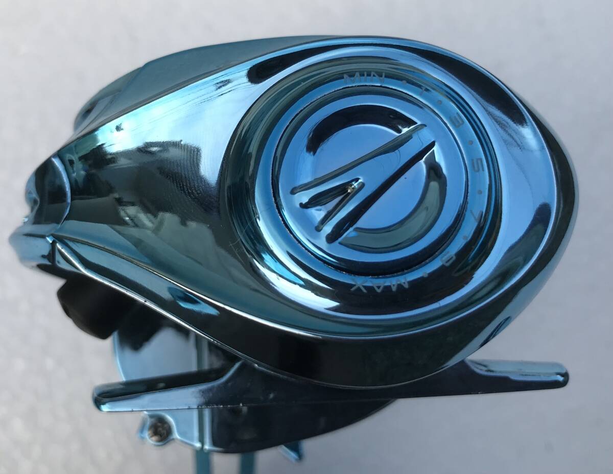写真のHAUT TONベイトキャスティングリールドルフィンDN200 スペシャルカラークロームスカイブルー右ハンドル(新品未使用)を発送します(送料無料)。