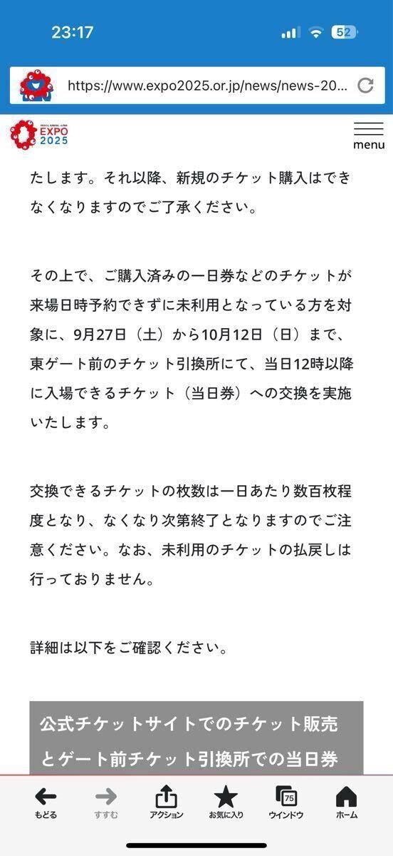9/27~10/12まで、東ゲート前のチケット引換所で当日12時以降に入場できる当日券との交換を実施します。枚数には限りがあり、なくなり次第終了となるため、ご来場いただいても交換できない可能性があります。