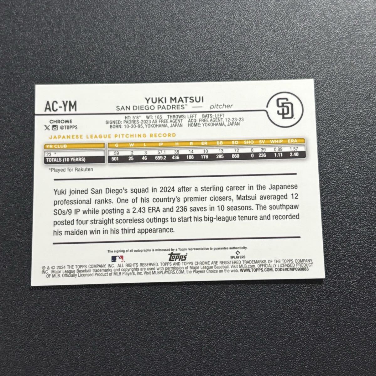 250枚限定 松井裕樹 2024 Topps Chrome PURPLE リフラクター 直筆サインカード Yuki Matsui Rookie Autograph MLBカード