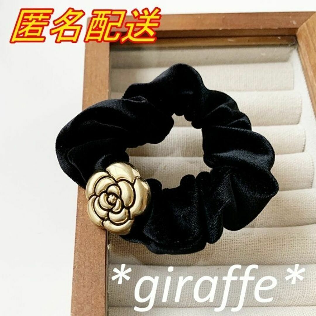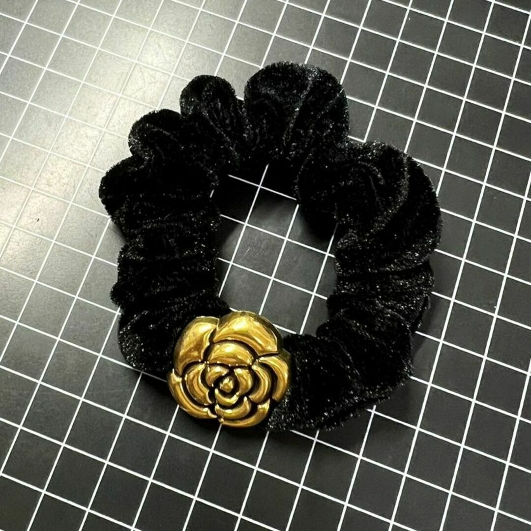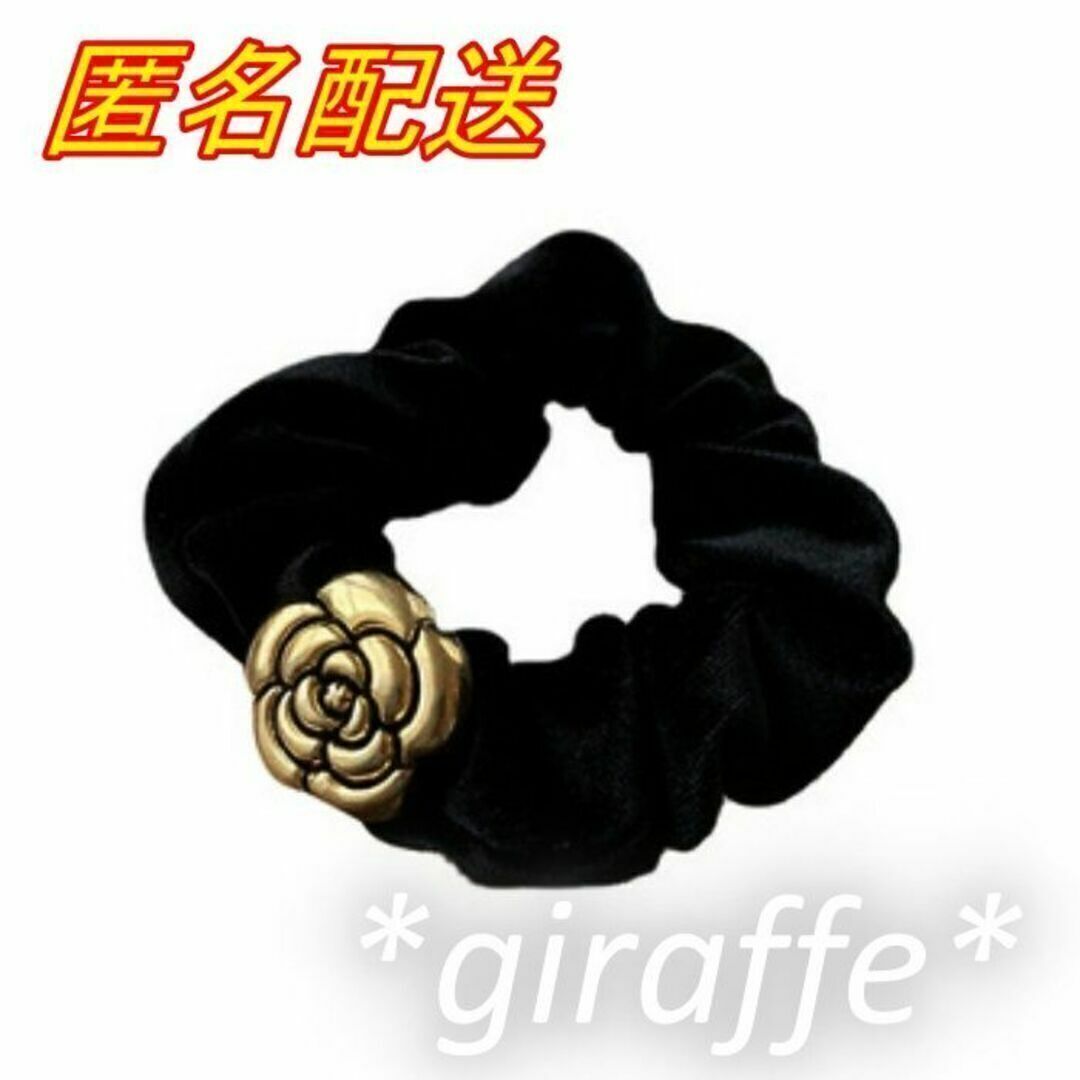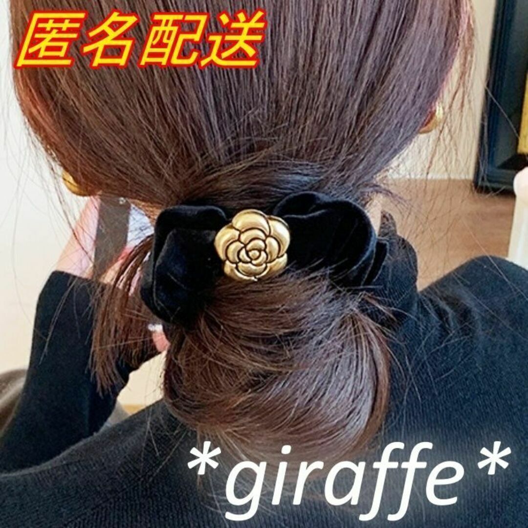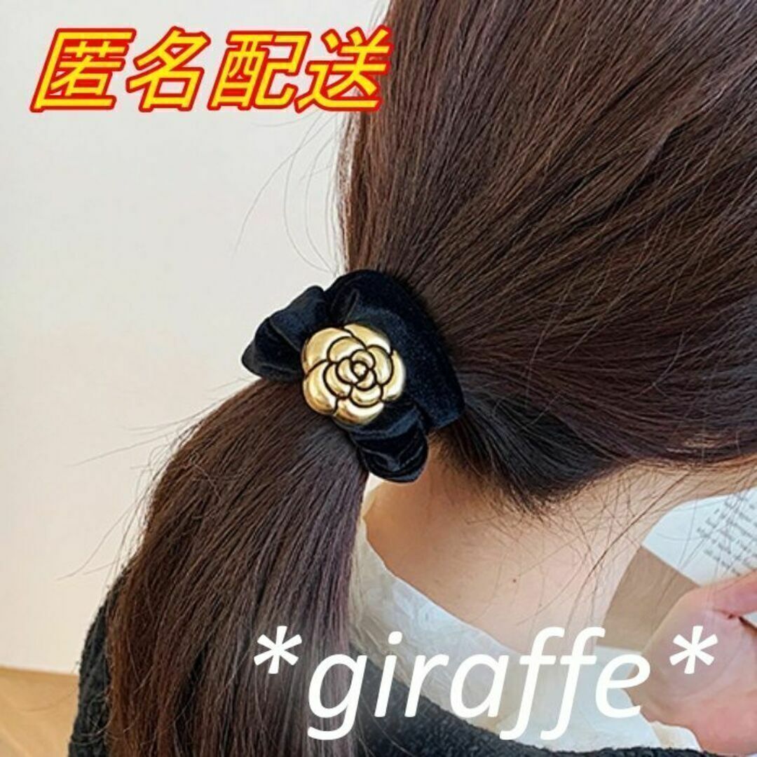 E196 匿名配送 シュシュ レトロ フラワー モチーフ ブラック ゴールド 髪ゴム ヘアアクセサリー 髪留め 一つ結び ハーフアップ