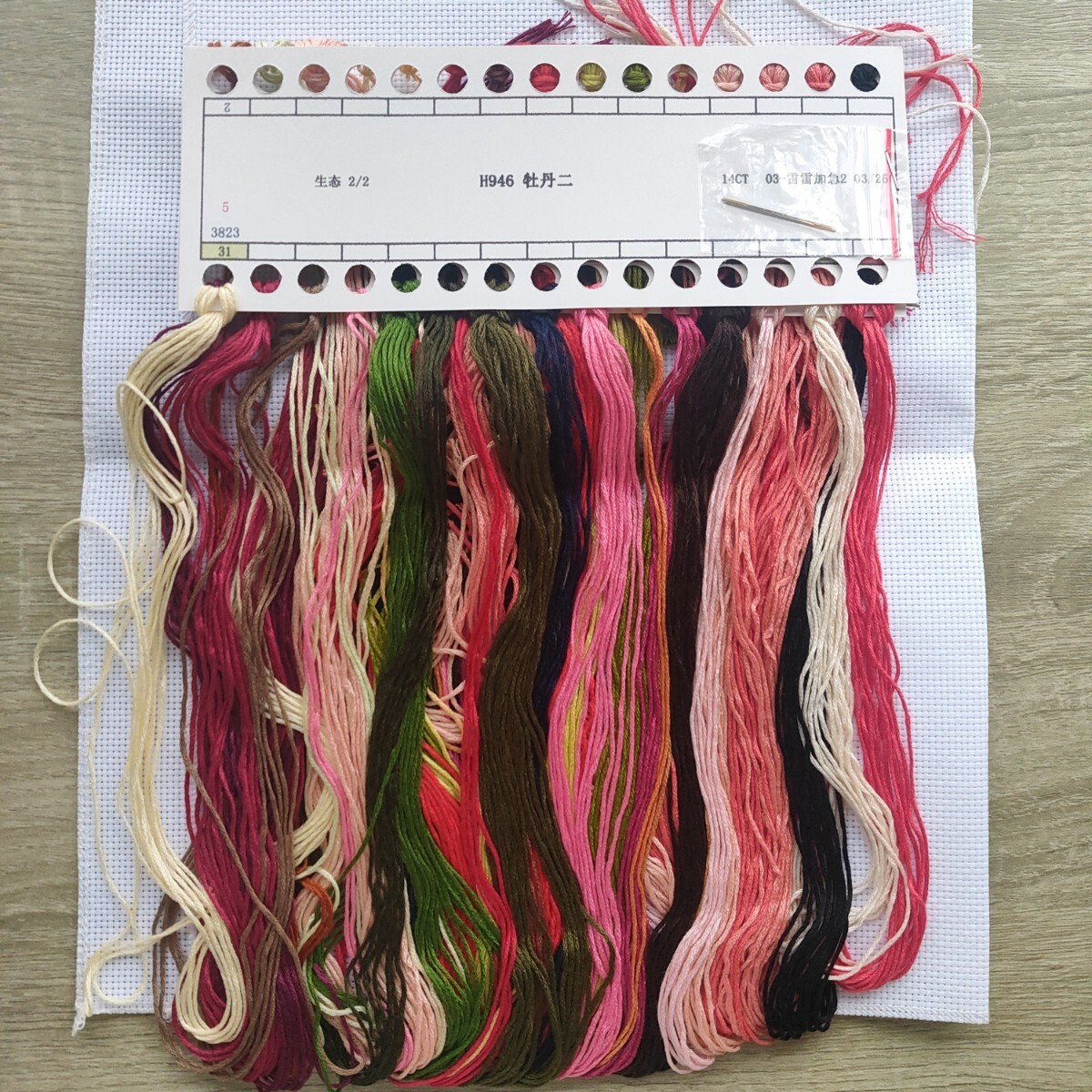 刺繍糸は余分に見積もって入っていますが、製作中もし足りなくなった場合は、ご自身でご用意ください。DMCの糸番号に対応しています。検品のため1度開封しています。