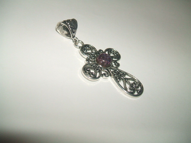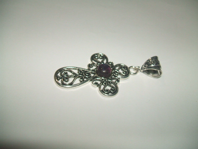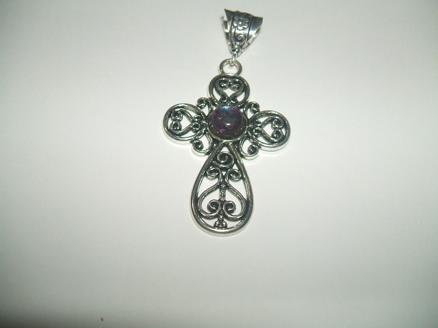 透かし模様でクロスデザインされたファイアーラブラドライトのトップです。石の大きさは直径8ミリ。トップ全体の大きさは4x3センチ。金属はシルバーで925の刻印があります。