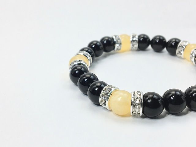 こちらは、8mm玉のオニキスとアラゴナイトを使ったパワーストーンブレスレットです。シンプルなデザインでどんなコーディネートにも合わせやすいデザインに仕上げています。サイズは内周約15cmです。気になる方は是非この機会にどうぞ。