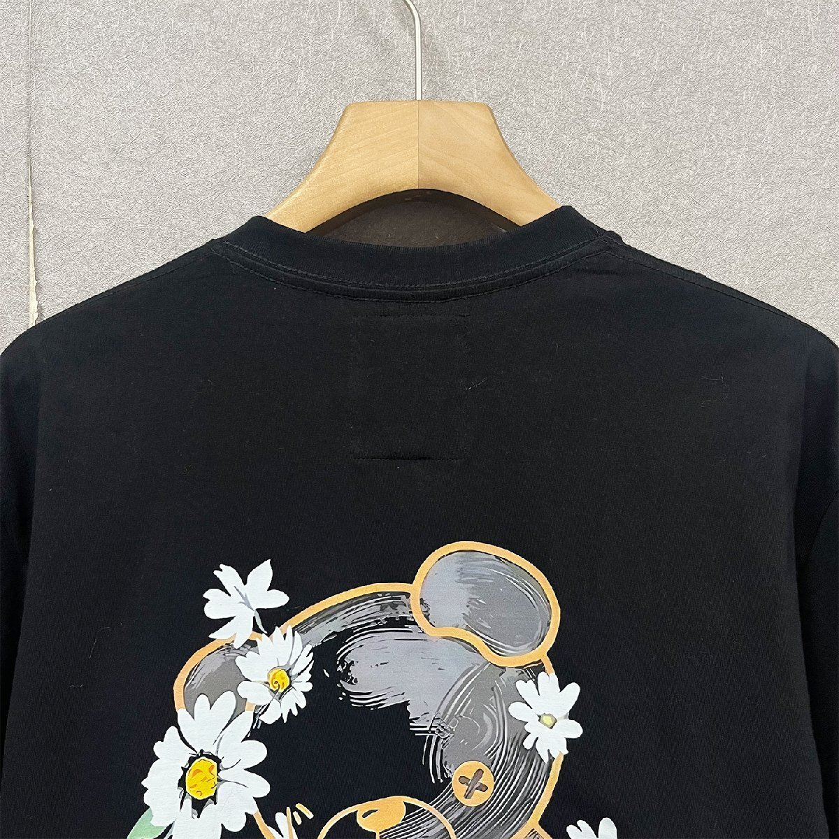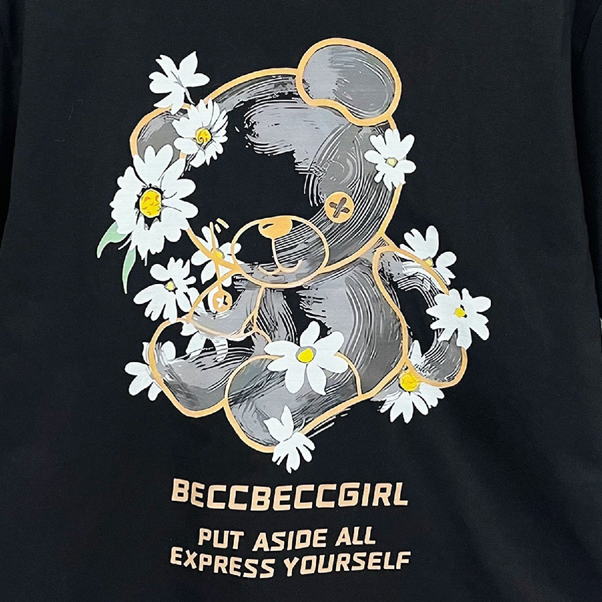 背面にはデイジーとクマのイラストをあしらい、可愛らしさと遊び心を感じさせるデザインに仕上げました。派手すぎず、絶妙なバランスでおしゃれな印象を演出します。胸元には個性的なロゴプリントを配置し、周囲と差をつけたい方にもぴったりの一着です。