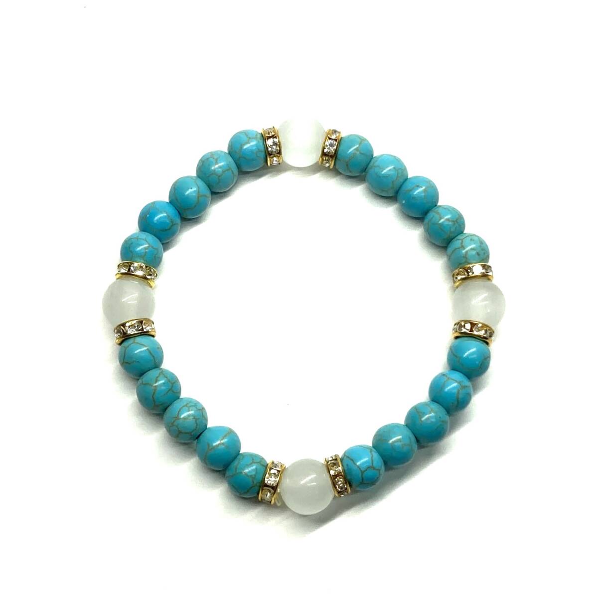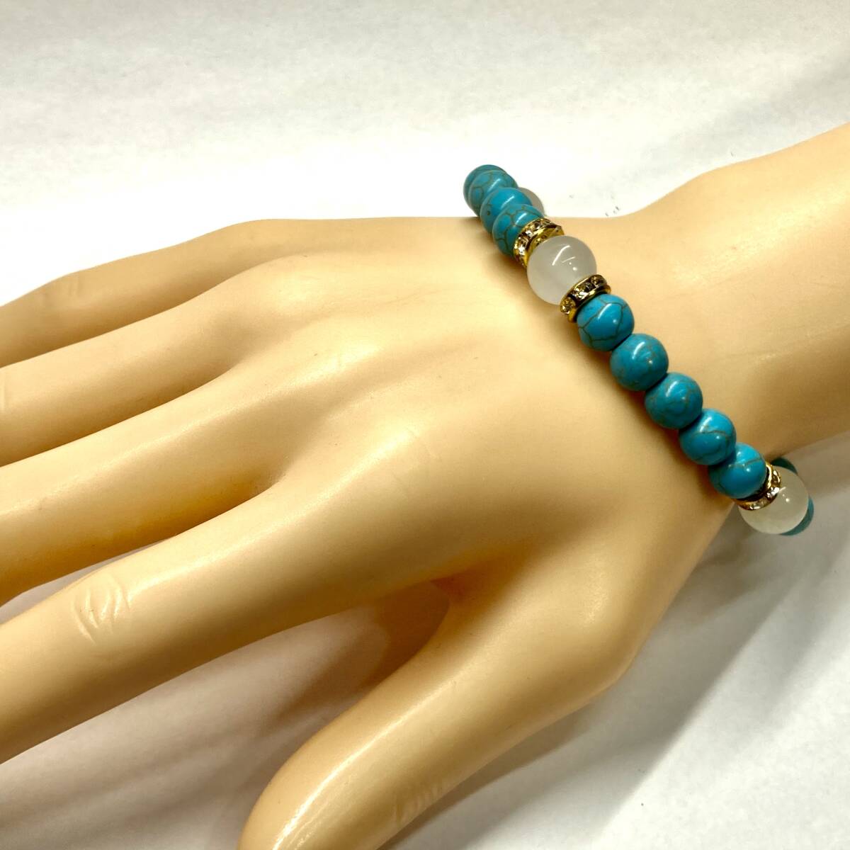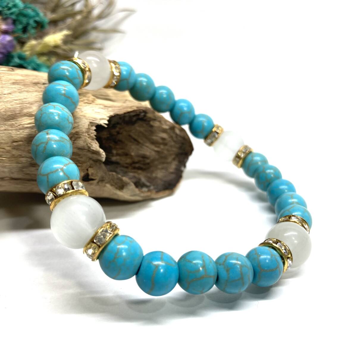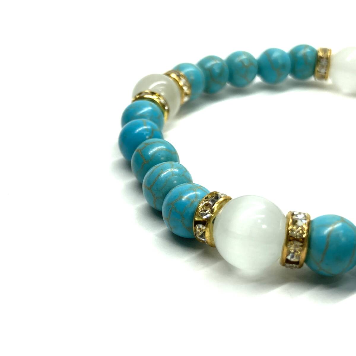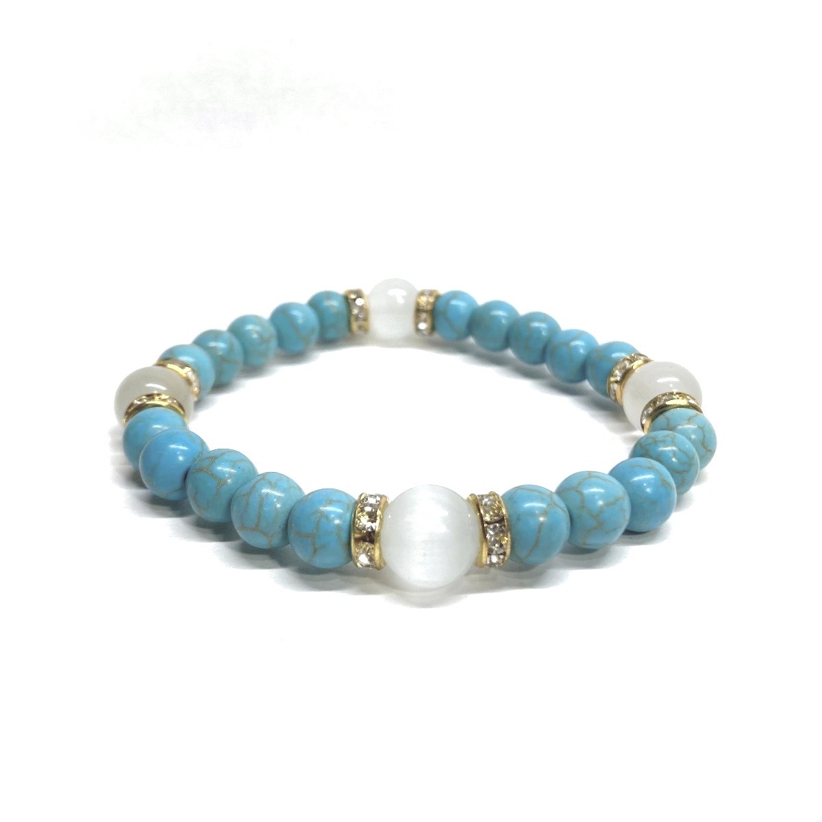 こちらは、8mm玉のキャッツアイとターコイズを使用したパワーストーンブレスレットです。間にはロンデルを挟み高級感ある大人っぽいデザインに仕上がっています。内周約17cmです。気になる方は是非この機会にどうぞ。
