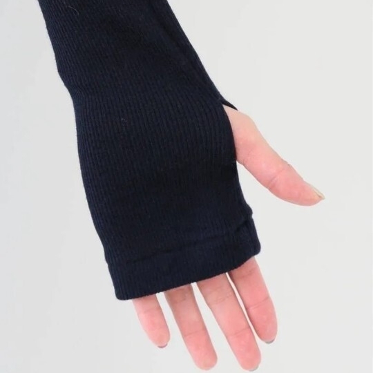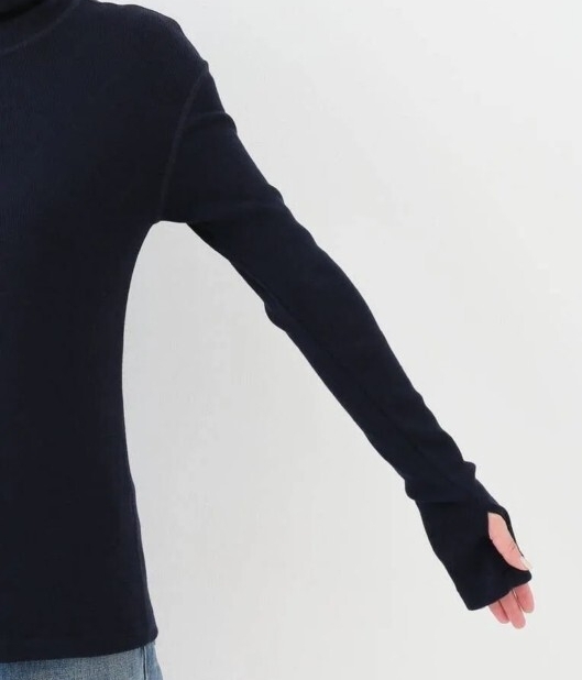 ジャケットやニット、スウェットなどのインナーとしても着用でき、長めの袖丈で指ぬきの仕様にしているので手元にのぞかせたり、ロングスリーブを生かして袖口にボリュームを出すのも可愛い。
