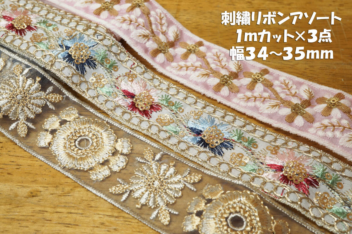 アソート内容は、1mカット×3点、幅34mm・34mm・35mm、色は「赤×ピンク×青×水色×白×ゴールド」「ゴールド×グレージュ」「ピンク×モカブラウン×白」でございます。
