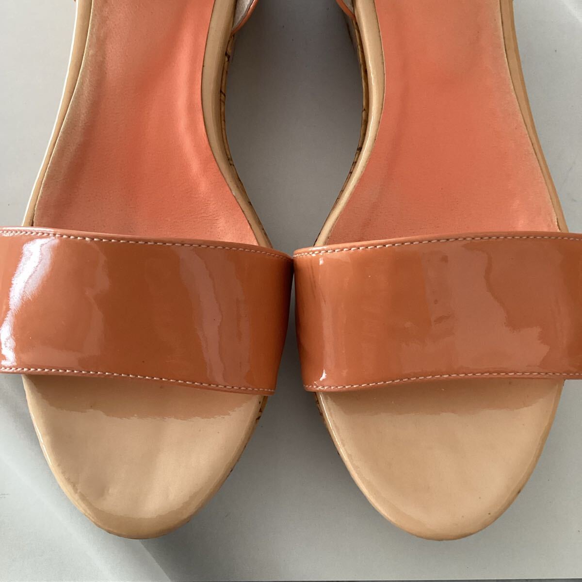 エナメル仕上げのオレンジ色のウェッジサンダル、ストラップ付きでカジュアルなスタイルに最適。