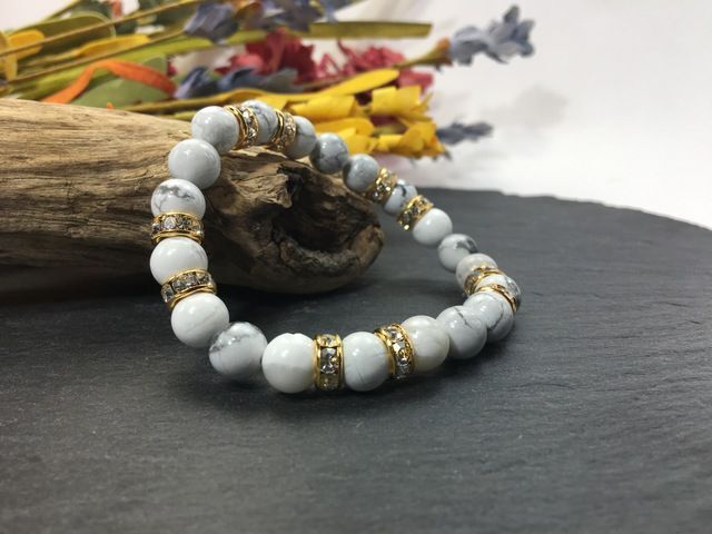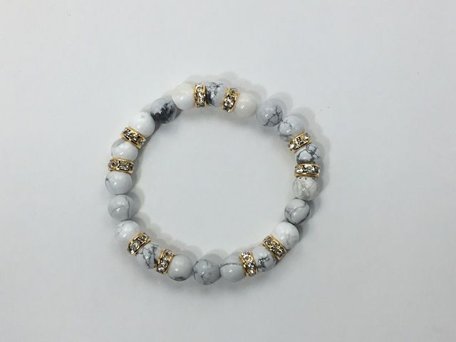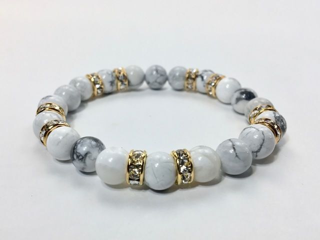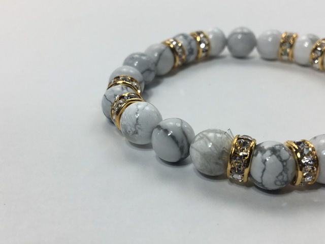 こちらは、8mm玉のハウライトを使ったパワーストーンブレスレットです。シンプルなデザインでどんなコーディネートにも合わせやすいデザインに仕上げています。サイズは内周約15cmです。気になる方は是非この機会にどうぞ。