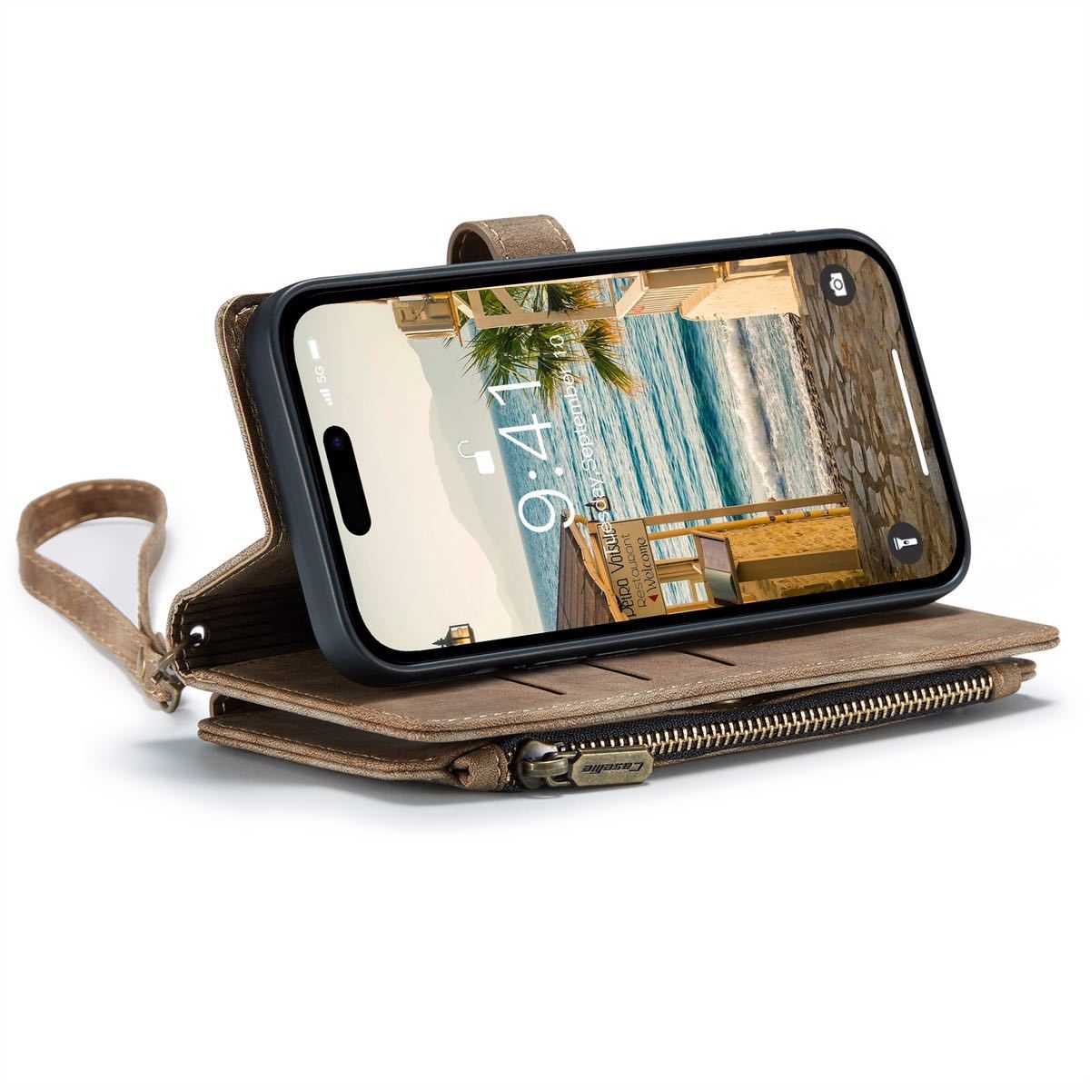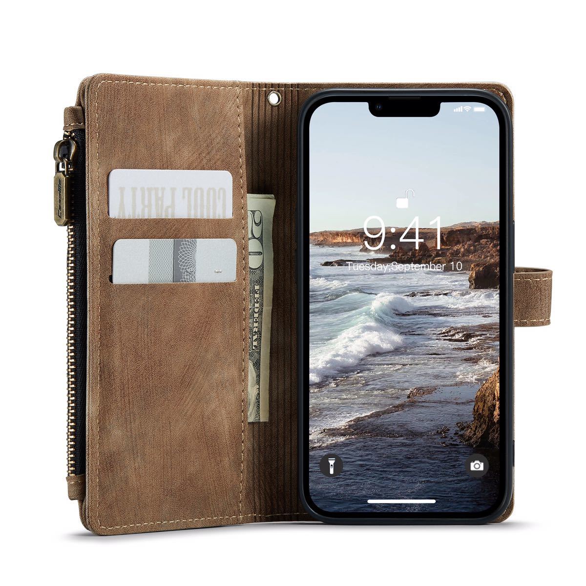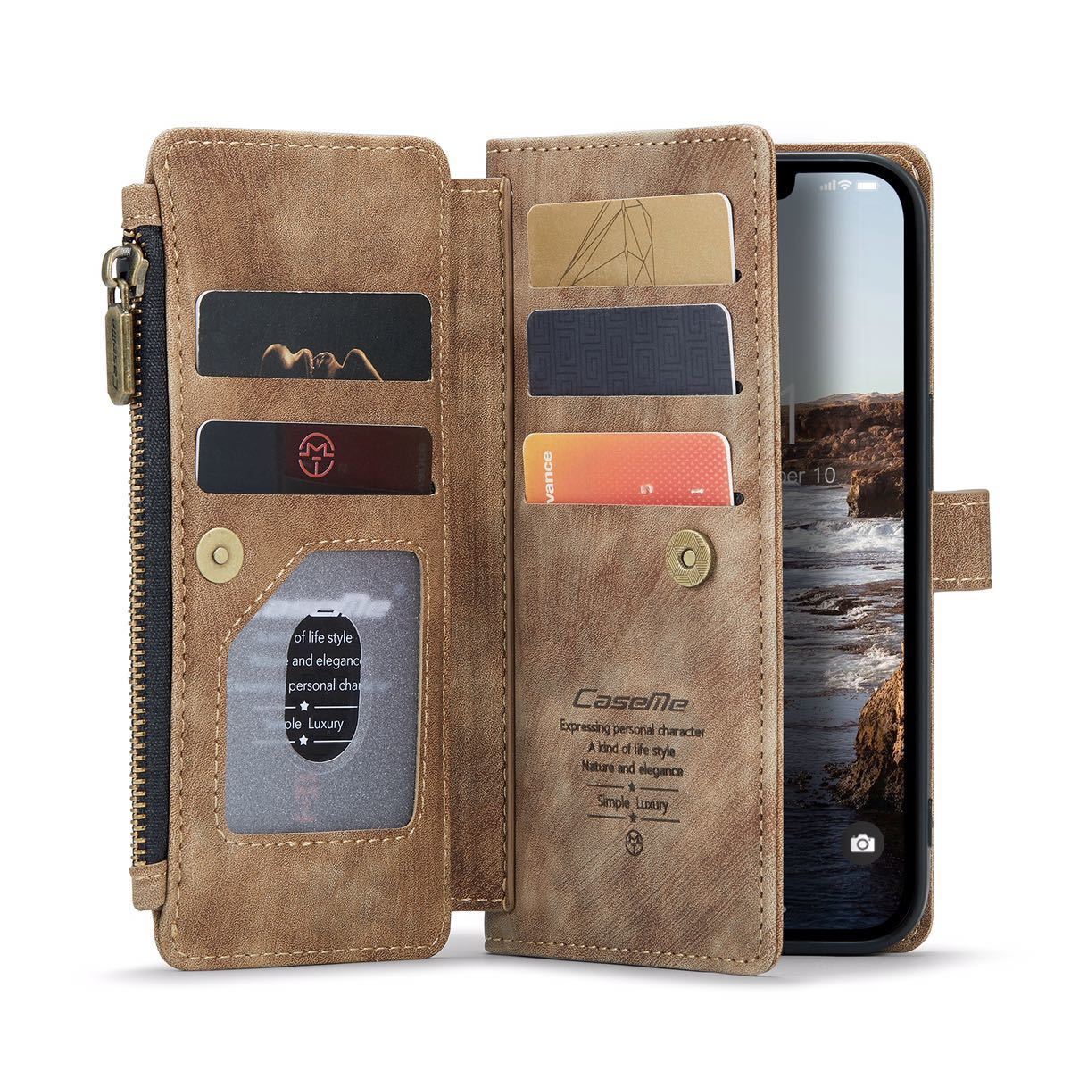 | 対応機種:iPhone 14 高品質のレトロ調PUレザーで丁寧に作られた、おしゃれな 多機能 iPhone アイフォン ケース・カバーです。カジュアルに過ぎず、フォーマルに過ぎず、どんなシーンにもふさわしい iPhone手帳型ケース。 使い勝手抜群、7枚カードまで収納できるカードポケットが付く。日常によく使うカードをたっぷり収納できます。iPhoneケースと財布が一体になる、望ましいアイフォン手帳型ケース。 プレミアムファスナー付きの小物入れポケットは、コインケース / キーケース / 小銭いれとして活用できます。あとフリースペースに折りたたみ紙幣を入れますので、スリム 財布型 iPhoneケース を探している方にオススメ。 動画視聴に便利なスタンド機能。横に置く際に、マグネット式のスナップは背面にくっつけるので、邪魔になることがありません。 端末をしっかりサポート。iPhone本体を嵌める背面ケースは柔らかいシリコン製となり、落下時の衝撃からiPhoneを守ります。※背面ケースはカバーから取り出すことができません。 | |||