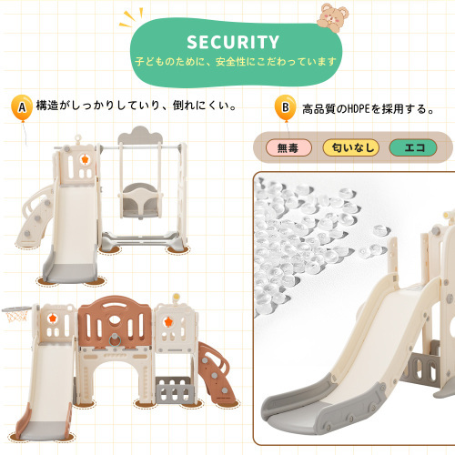 • 【SECURITY 】子どものために、安全性にこだわっていますA 構造がしっかりしていり、倒れにくい。B 高品質のHDPEを採用する。無毒 匂いなし C 鋭い角がなく、表面をツルツルにささくれなどはなく、肌にやさしい D 可愛いくま模付き