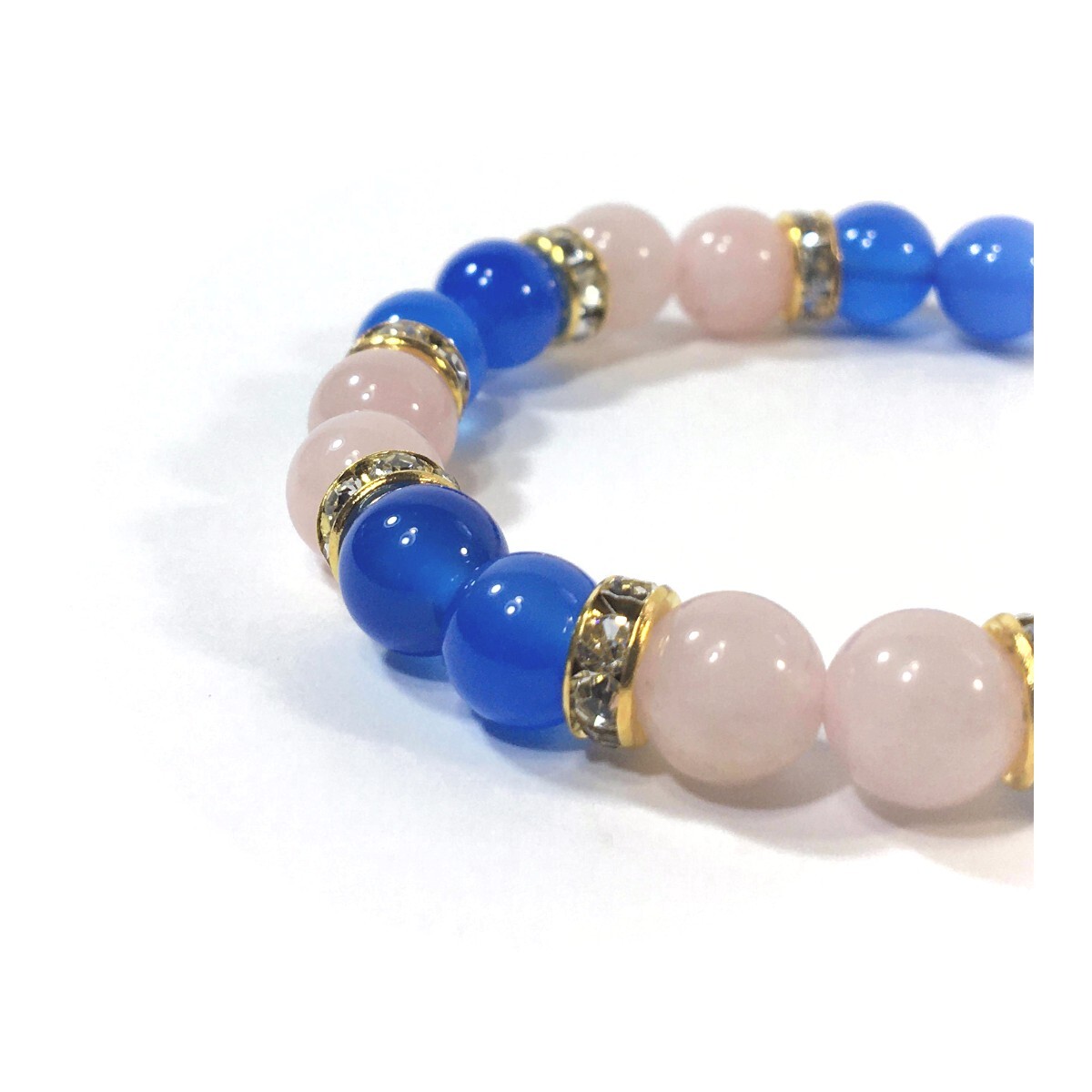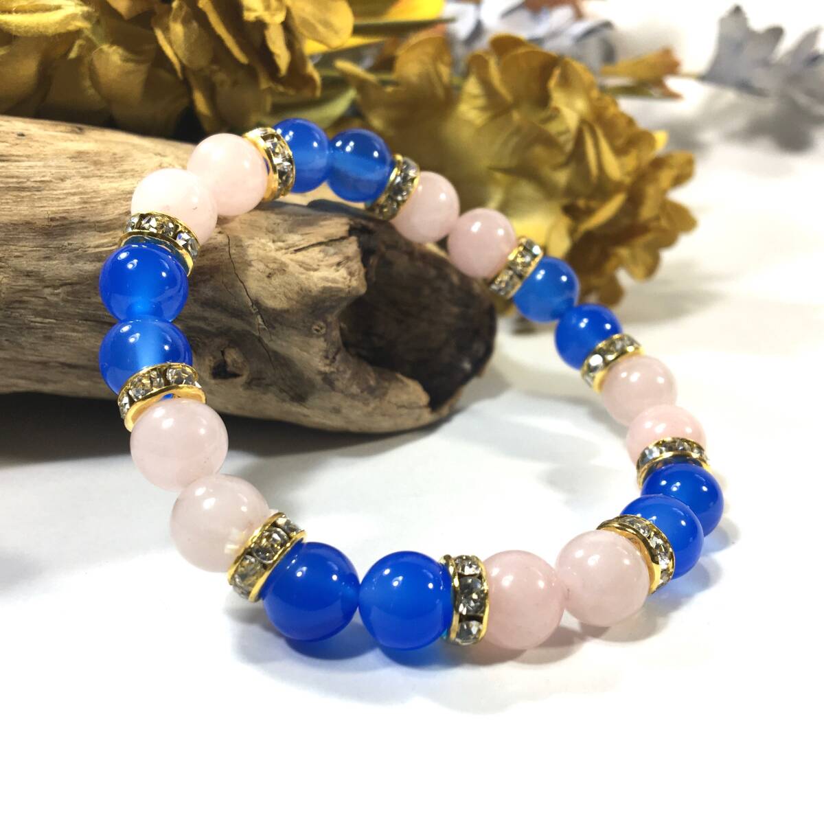こちらは、8mm玉のローズクォーツとブルーメノウを使ったパワーストーンブレスレットです。シンプルなデザインでどんなコーディネートにも合わせやすいデザインに仕上げています。サイズは内周約15cmです。気になる方は是非この機会にどうぞ。