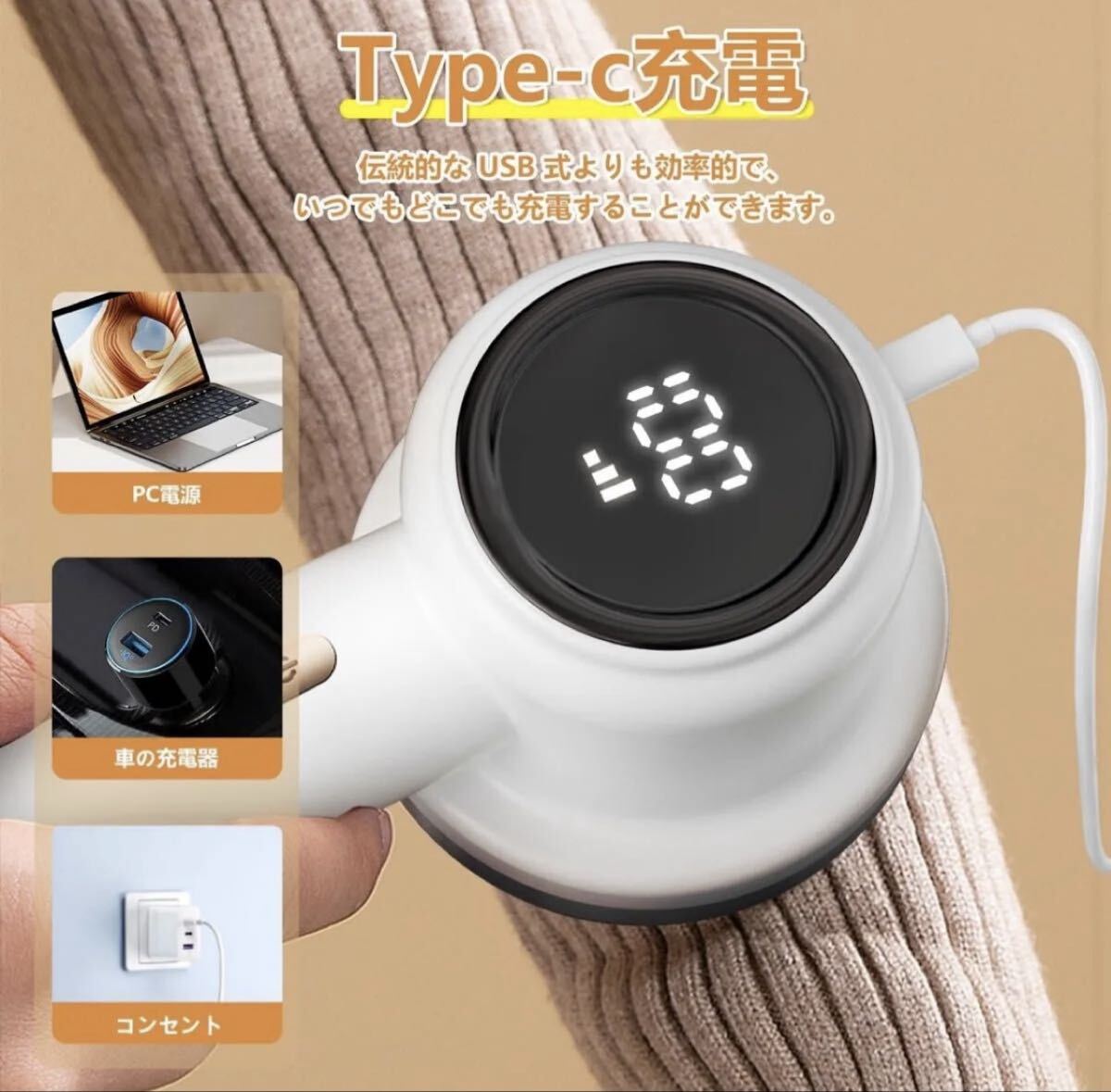 【LED 液晶ディスプレイ & Type-C 充電】毛玉取り器は LED ディスプレイを搭載し、電源を入れると残量 / モード / 充電状態が一目瞭然です!使用中に突然電池が切れたり、残量が分からなくなる心配はありません。Type-C 充電設計により、どこでも簡単に充電できます。電池が切れても電源コードを接続すればそのまま使用可能で、旅行先や自宅での使用に最適です。