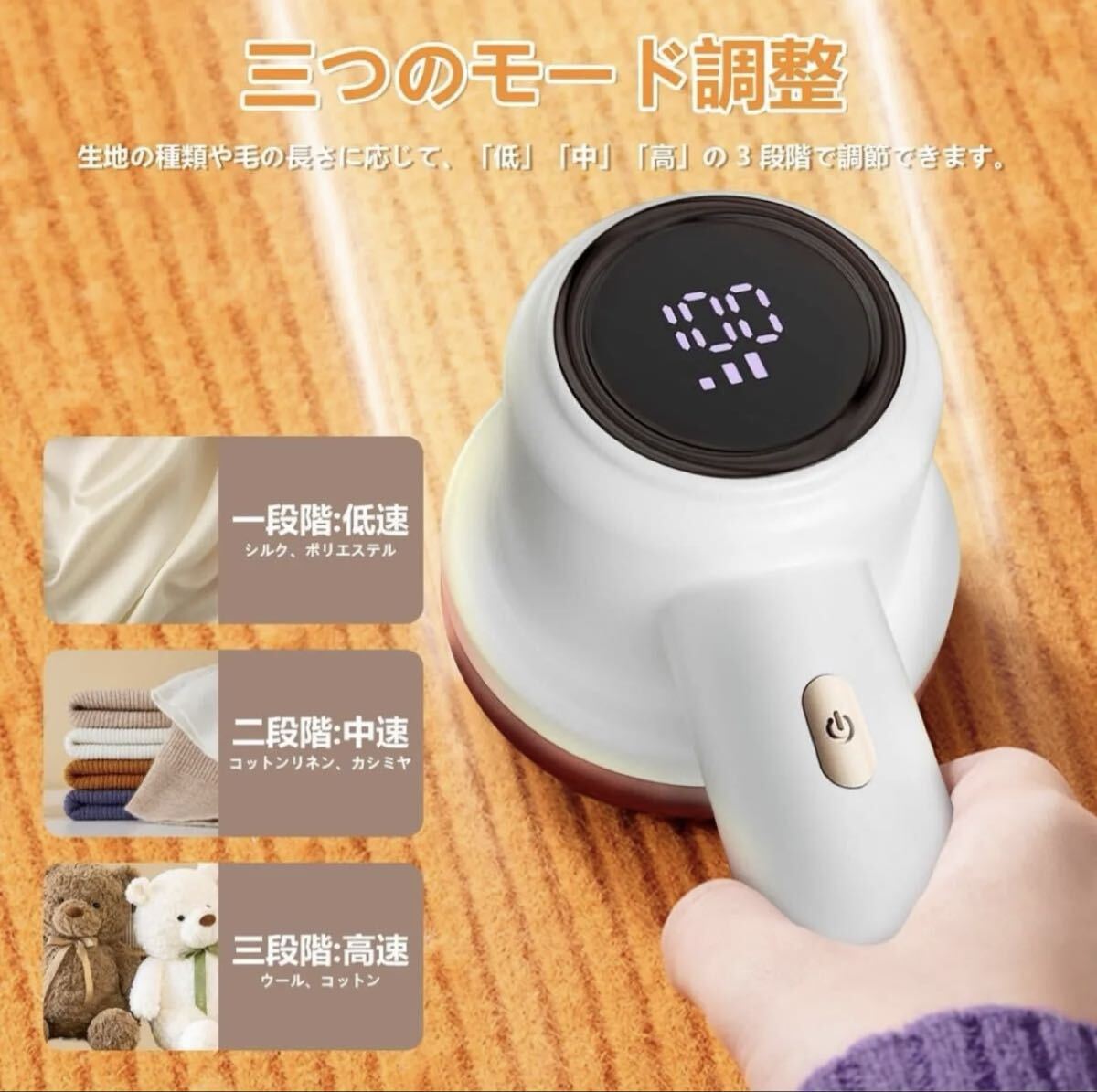 【3 段階モード調節、様々な生地に対応】生地の種類と毛足の長さに合わせて、毛玉取り器の回転数を低-中-高の 3 段階で調節できます。衣類のみならず、ぬいぐるみや寝具、ソファなど幅広く使用可能です。精密な回転数制御と安全カッター網により、「1 台で万能」を実現します。