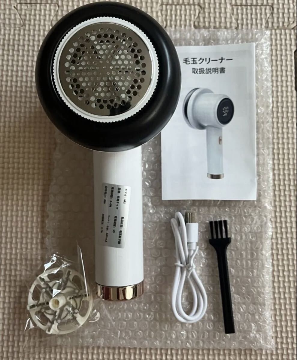 【100% サービス保証】パッケージ内容:毛玉取り器本体 ×1、クリーニングブラシ ×1、USB ケーブル ×1、交換用ブレード ×1(合計 2 枚)、取扱説明書 ×1。