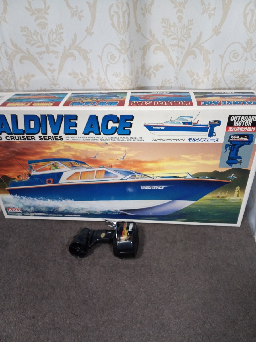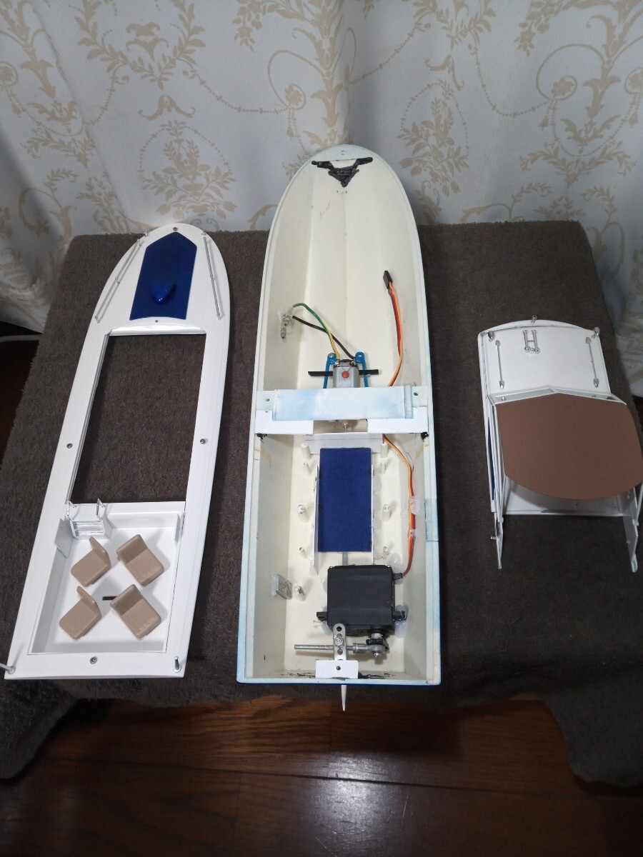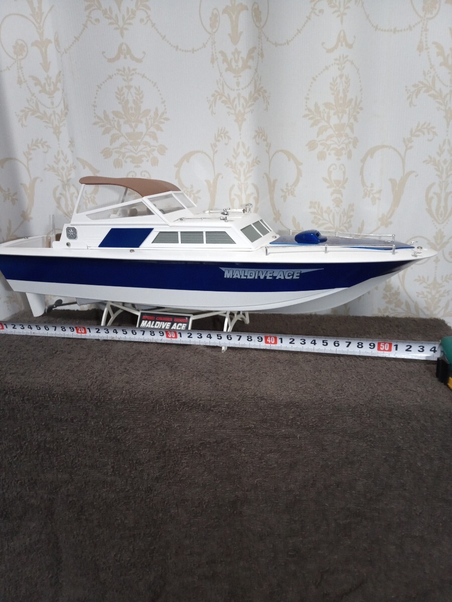 アリイの古いモーターライズプラモデルをラジコン化してメカを外した物です。サーボとモーターのみ付属します。船長は約45センチとプラモデルとしては大きいです。メンテナンス出来るようにネジ6本で3分割できるようにしてます。外装はオリジナルではなく多少改造してます。浴槽で走らせたらバランスも良く安定してました。船底やスクリューの辺りは傷や塗装ハゲもあります。船外機もありますが取り付けステーがないのでそのままでは取り付け出来ません。ノークレームノーリターン。プラモデルなので輸送中の破損に関しては落札者様で修理して下さい。箱を作って80サイズでギリギリ収まると思いますがオーバーした場合は100サイズになります。