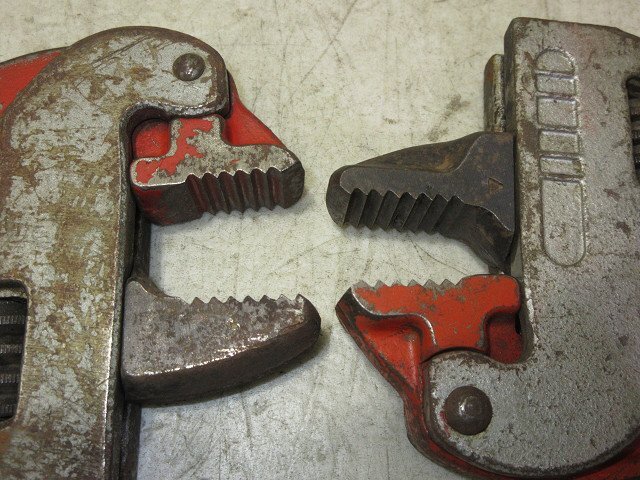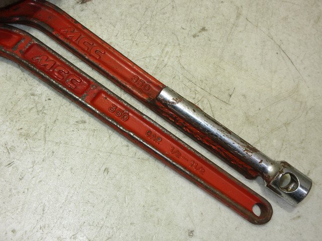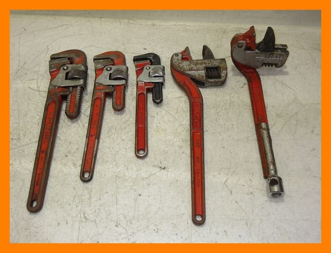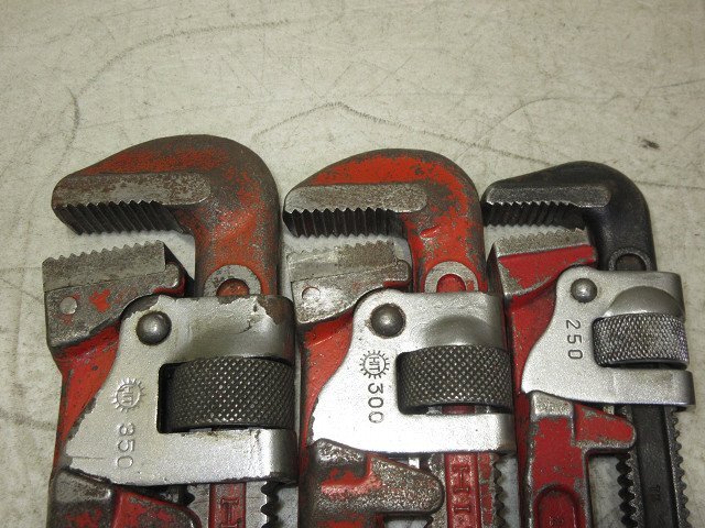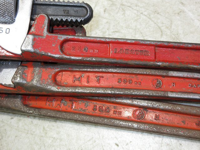 こちらで動作確認しておりますが、画像青枠部分のバネが利いておりませんので予めご了承ください。(返品対象外) その他、特に問題は感じられませんでした。 ロブスター / HIT / MCC パイプレンチ 250・300・350mm 5点セット 縦・コーナー 写真に写っている物がすべての付属品になります。 | ||