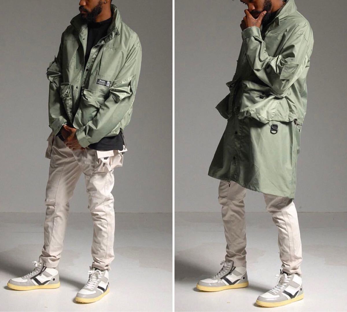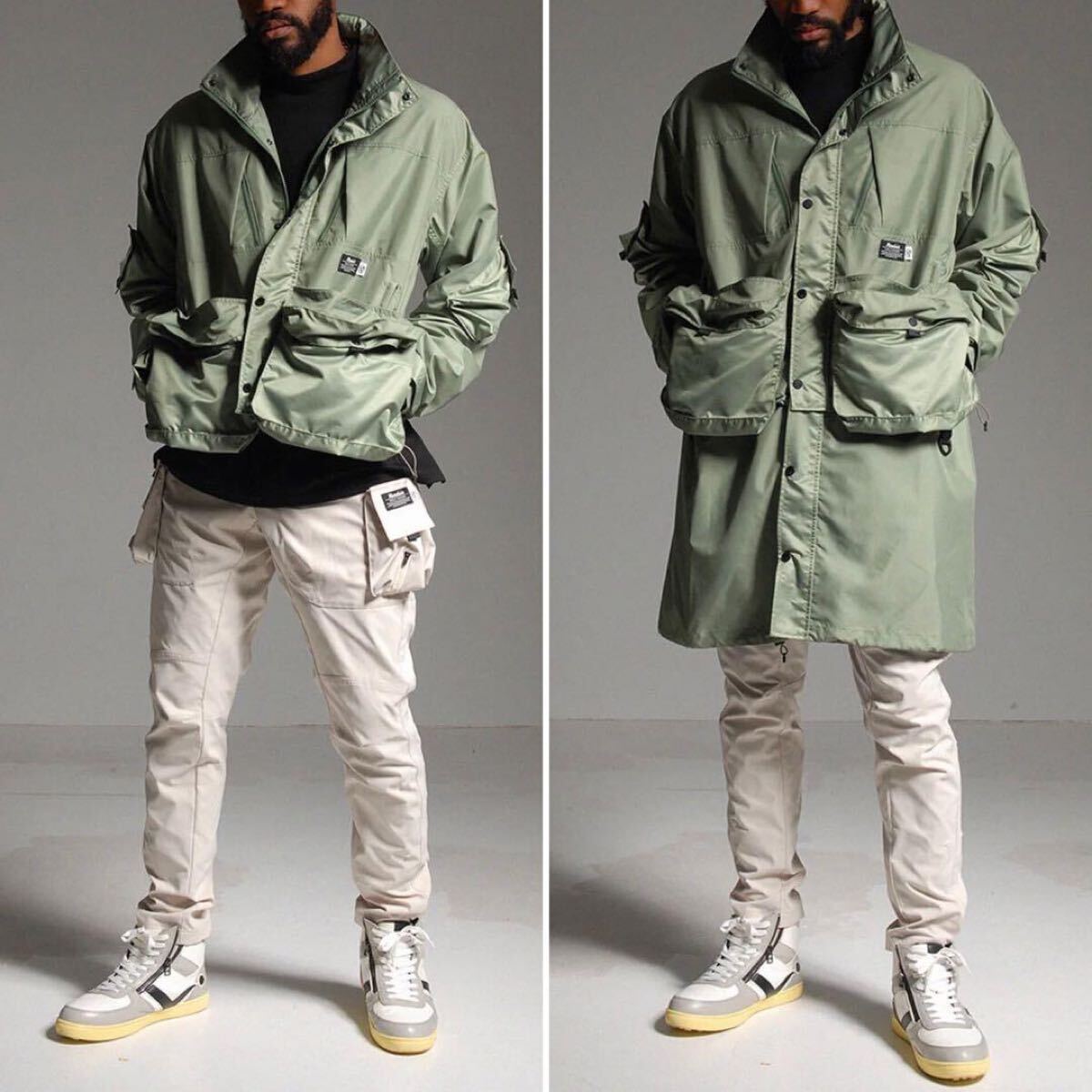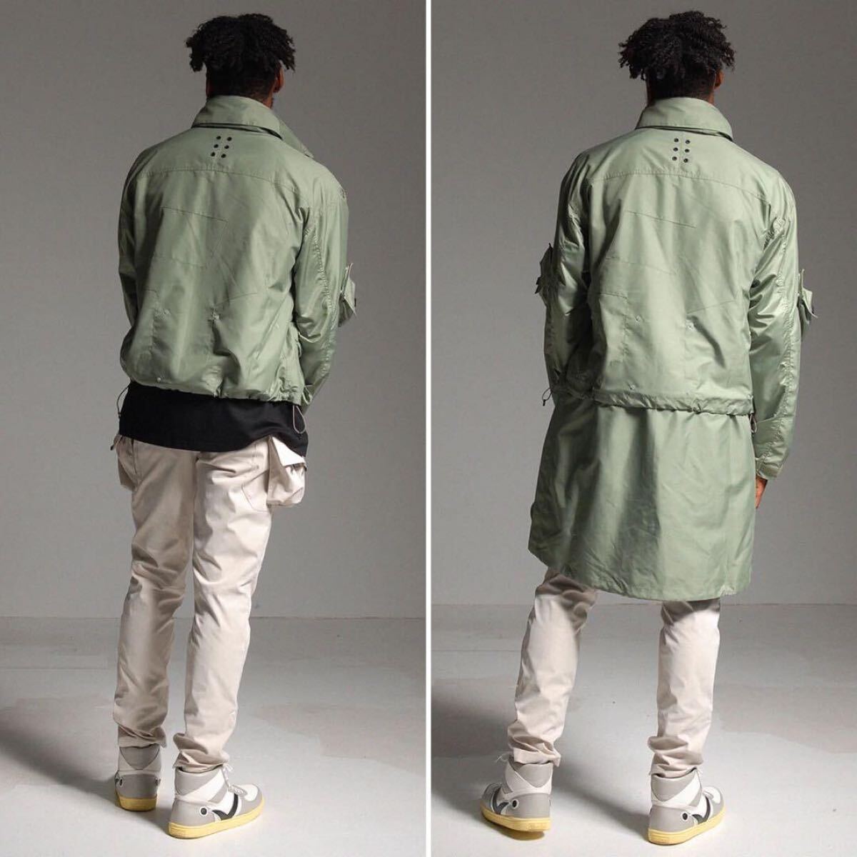 通常時はロング丈デザインのジャケットですが、ウェスト下よりファスナーでコートパーツを取り外すことでショート丈ジャケットとしても着用が可能です。