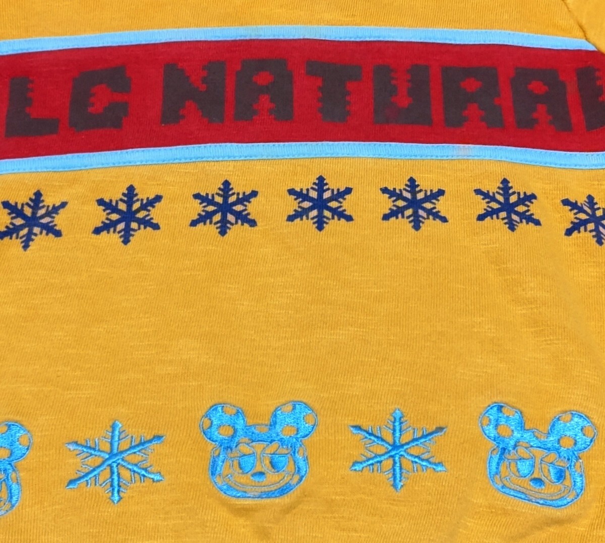 腹部まわりのキャラクターと雪の結晶は明るめ青色の光沢のある刺繍糸です。