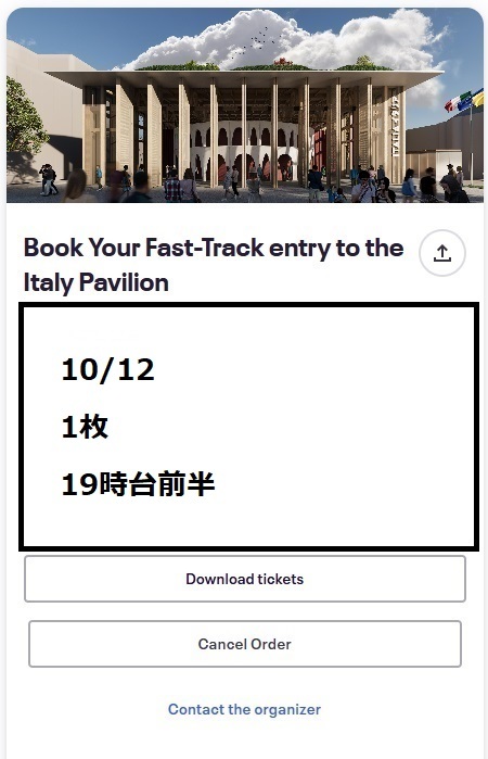 イタリア館 パビリオン予約チケット  1枚(1人分)10/12 19時台前半予約です。