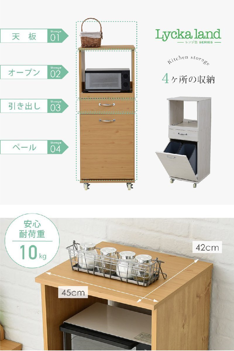 ■商品説明 木目調とガラスのカントリーテイストが可愛いリュッカランドのキッチンシリーズ。斜め開閉の下部には付属のペールが2つ収まる収納部を完備!ゴミの分別もばっちり。 |
