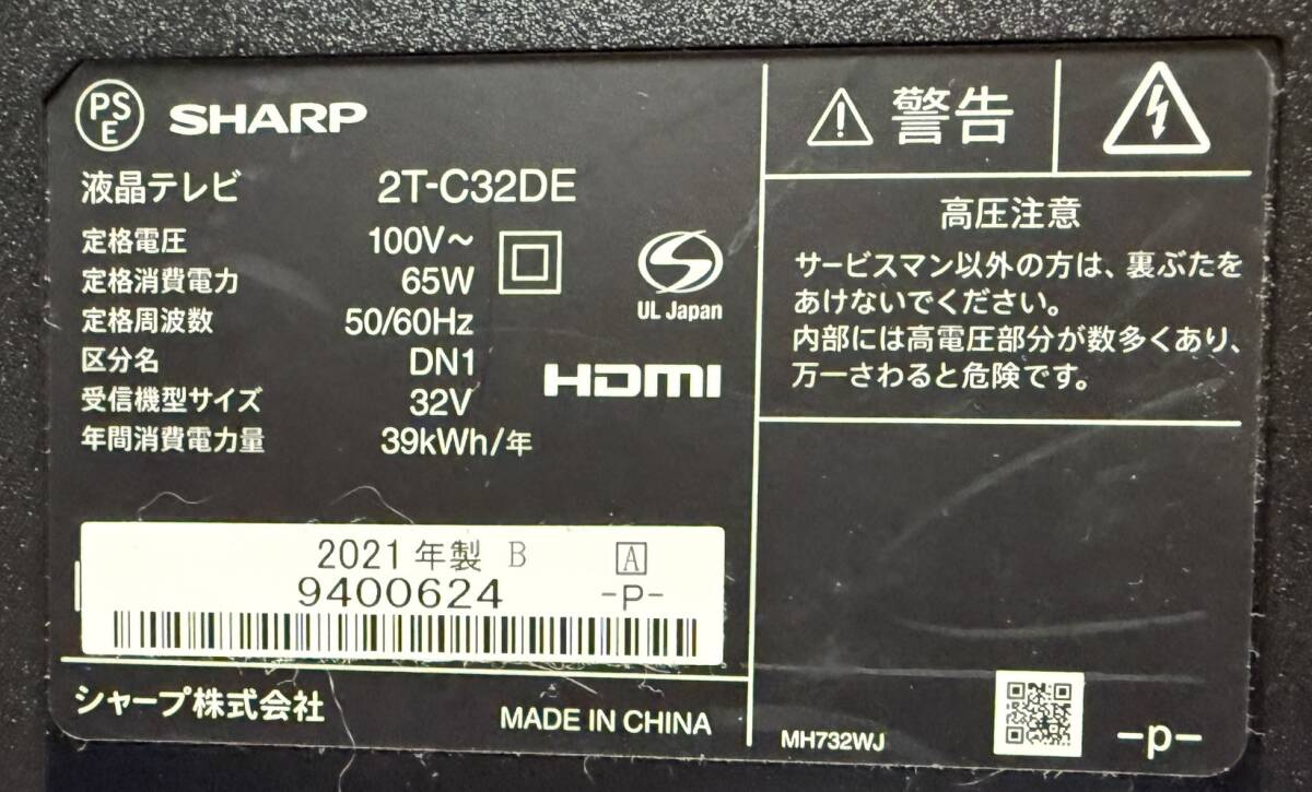 森河808 SHARP シャープ 32V型 AQUOS ハイビジョン液晶テレビ 2T-C32DE 直下型LEDバックライト リモコンなし 通電のみ確認済み